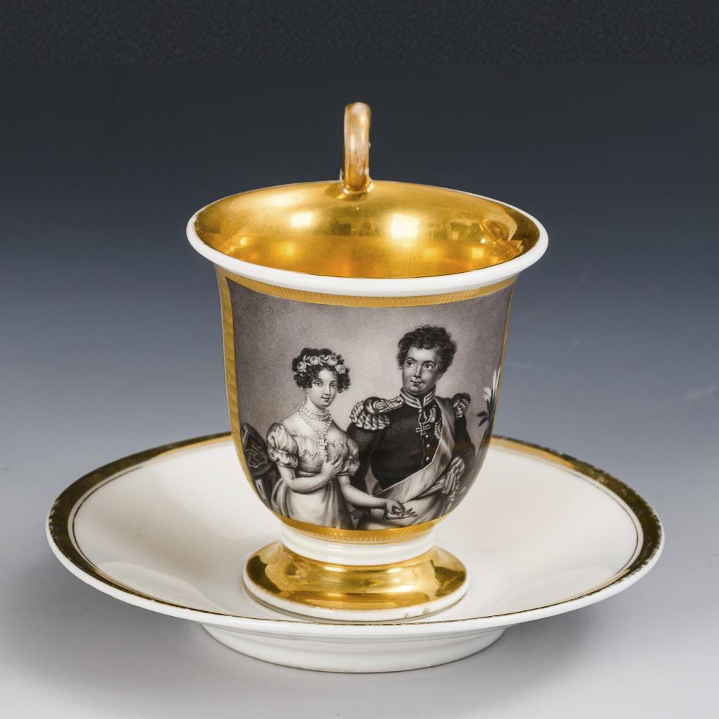 Gefußte Glockentasse mit Rosettenhenkel. Schauseitig eine Rechteckkartusche mit dem schwarzlotgemalten Porträt von König Friedrich Wilhelm IV. (1795-1861) und Elisabeth von Preußen (1801-1873) als Kronprinzessin, verso teils floral radierter Goldfond. Minimale Goldbereibung.
