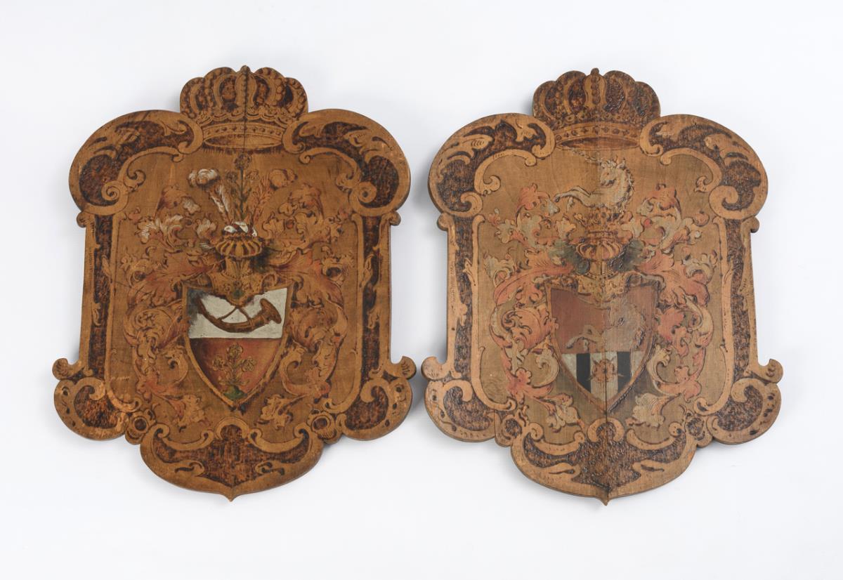Geschweifte Schilder mit Krone und Rocaillenrahmung. Je Vollwappen mit Helmdecke und Helmzier: Geteiltes Schild mit Horn und Rose bzw. Einhorn und Lutherrose. Je verzogen, teils geöffnete Leimfugen, 1 geringer Trockenriss, 1x geringe Anobienspuren, einige wenige Alters-/Gebrauchsspuren.
