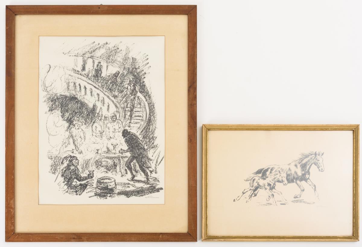 Stute und Fohlen: verglast und gerahmt: 26 x 33,5 cm | Szene in Auerbachs Keller aus Goethes Faust, Platte: 37 x 27,5 cm, verglast und gerahmt: 52 x 41 cm.