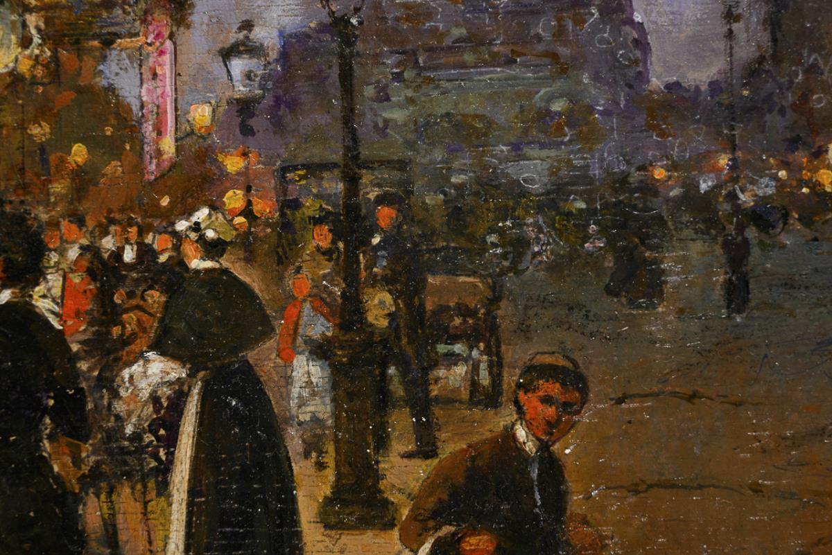 Viele Menschen am Abend bei den erleuchteten Geschäften nahe der Statue der Marianne unter wolkigem Himmel. Minimale Altersspuren.