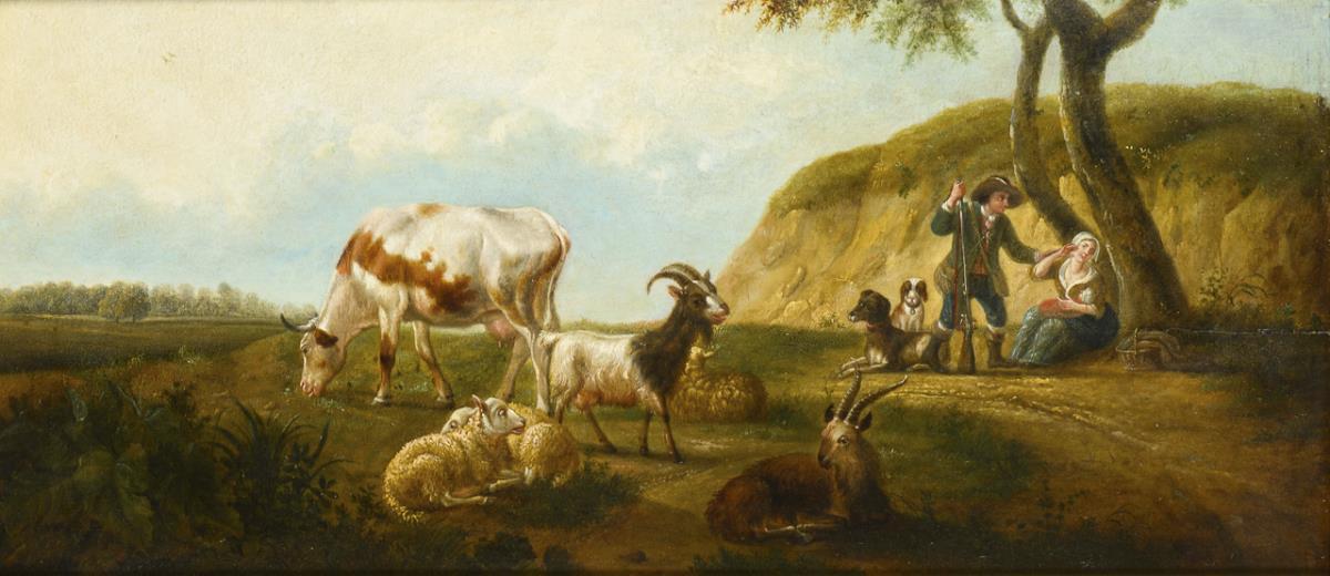 Zudringlicher Jäger bei einer Hirtin unter einem Baum nahe dem Vieh auf der Wiese. Altersspuren.