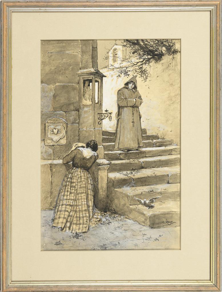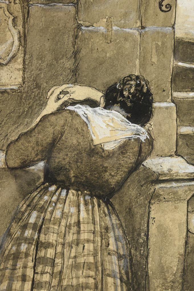 Neugierig die Treppe herabkommender Mönch, der zu einer weinend an der Mauer stehenden jungen Frau blickt.