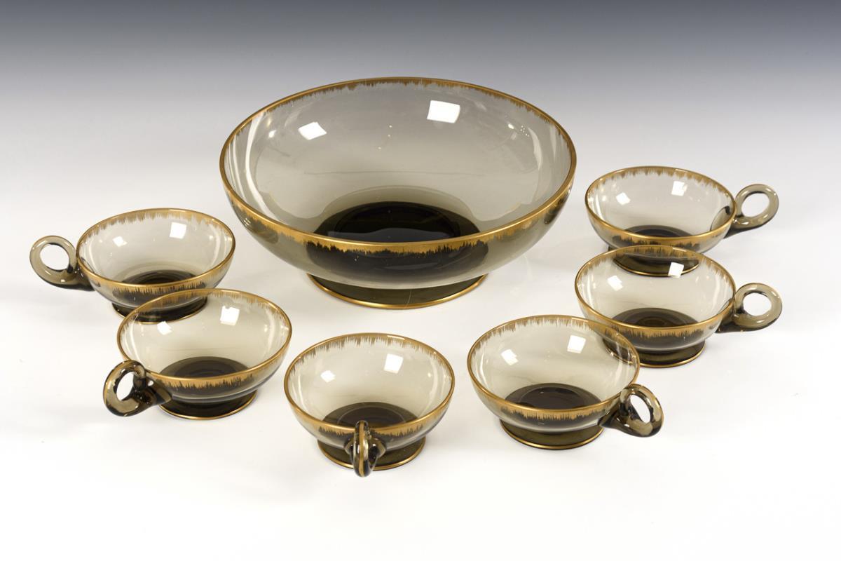 Rauchglas, gefranster Poliergoldrand. Schale (Ø 22 cm), 6 Desserttassen (H 5,5 cm).
