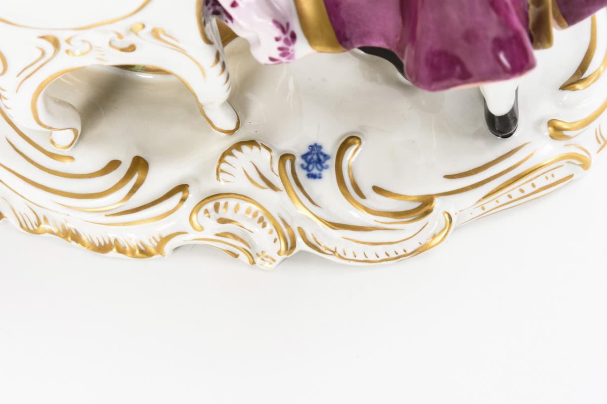 Auf einem Stuhl sitzende, eine Mandoline spielende Rokokodame mit spitzenbesetztem Kleid, zu ihrer Rechten ein Kavalier mit Blumenstrauß und Notenbuch stehend. Spitze minimal bestoßen, 1 Blüte fehlt.