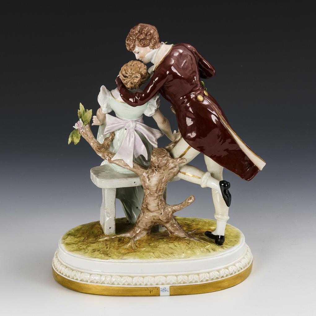 Auf einer Bank sitzende junge Dame sowie der sich zu ihr beugende, die Dame küssende junge Herr.