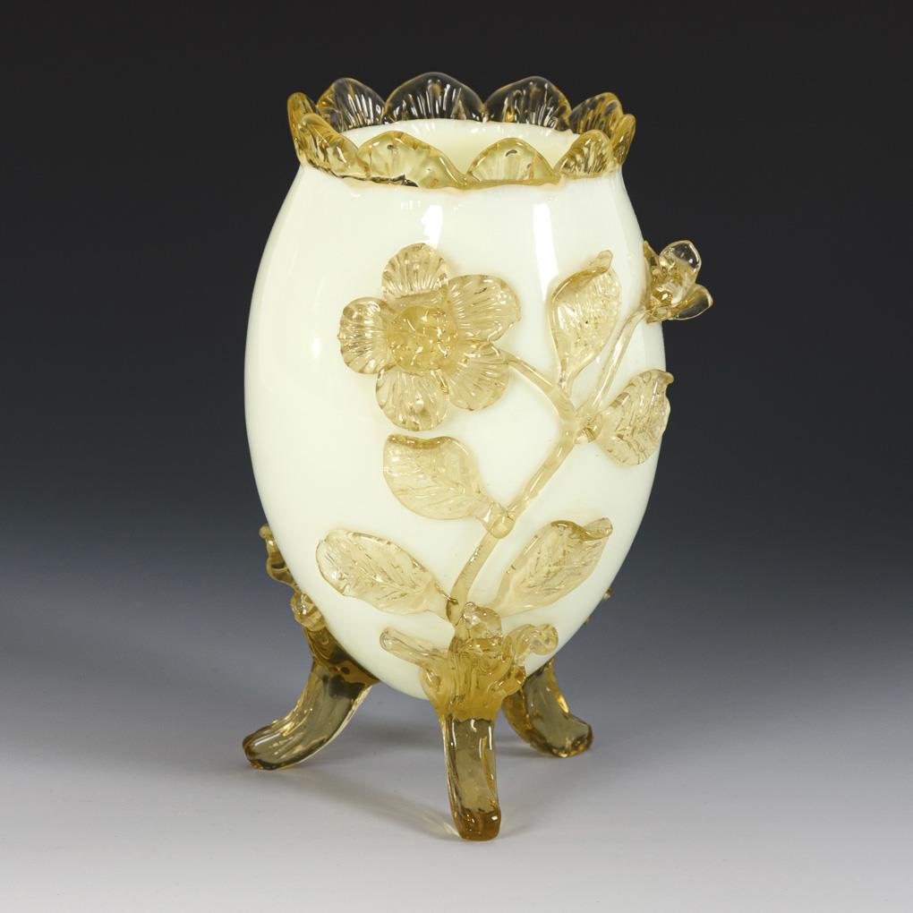Ovoide Vase aus weißem Opalglas mit aufgeschmolzenem mehrpassigen Rand, drei Füßen und Blumenzweig aus topasfarbenem Glas.