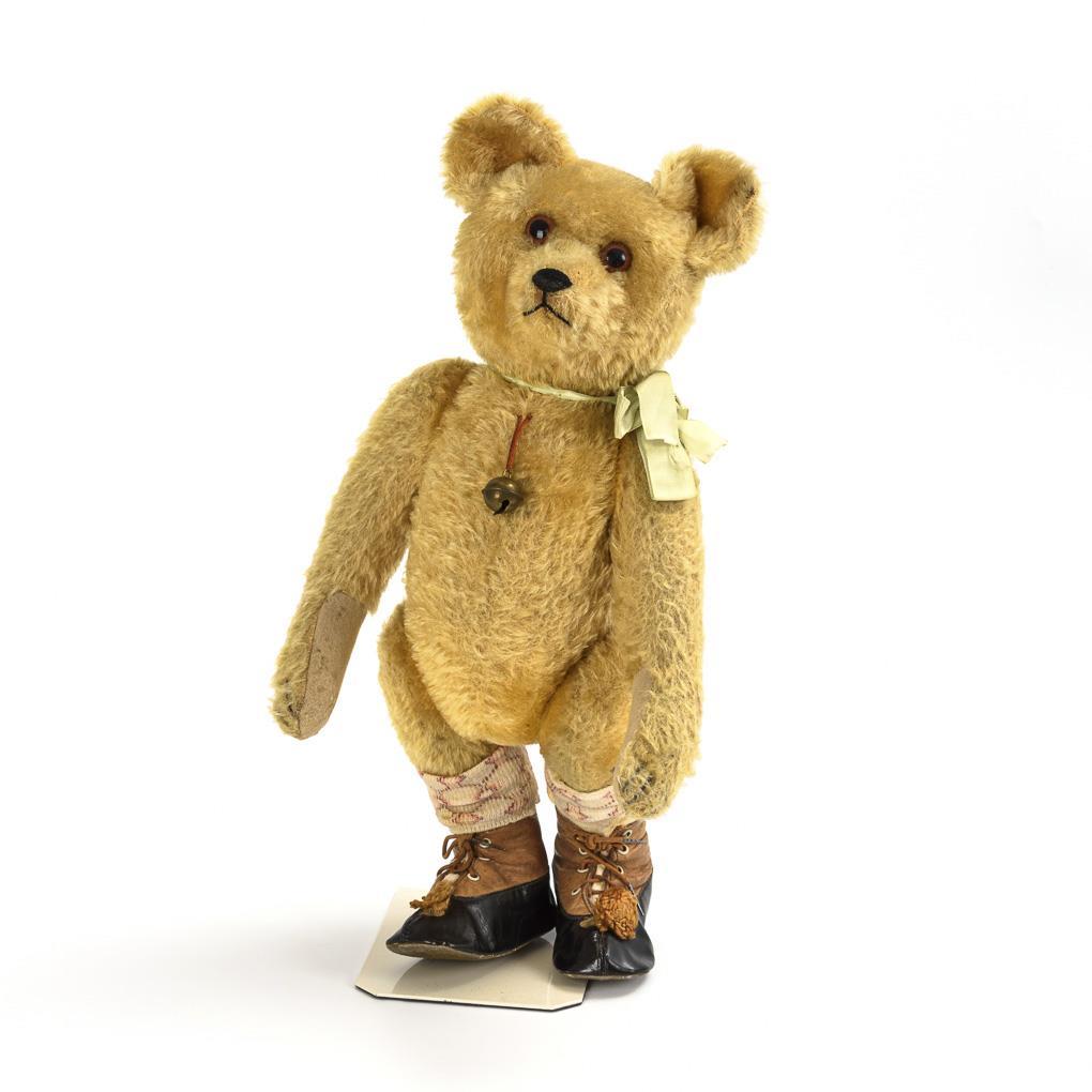 Blonder Teddybär mit langen Armen, kleinem Buckel und alten Glasaugen mit großen Pupillen, horizontale Nasenbestickung, originale Schleife und Glocke. 2-farbigen Kinderschuhen. Pfoten mit winzigen Löchern, etwas fleckig.