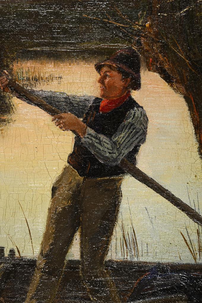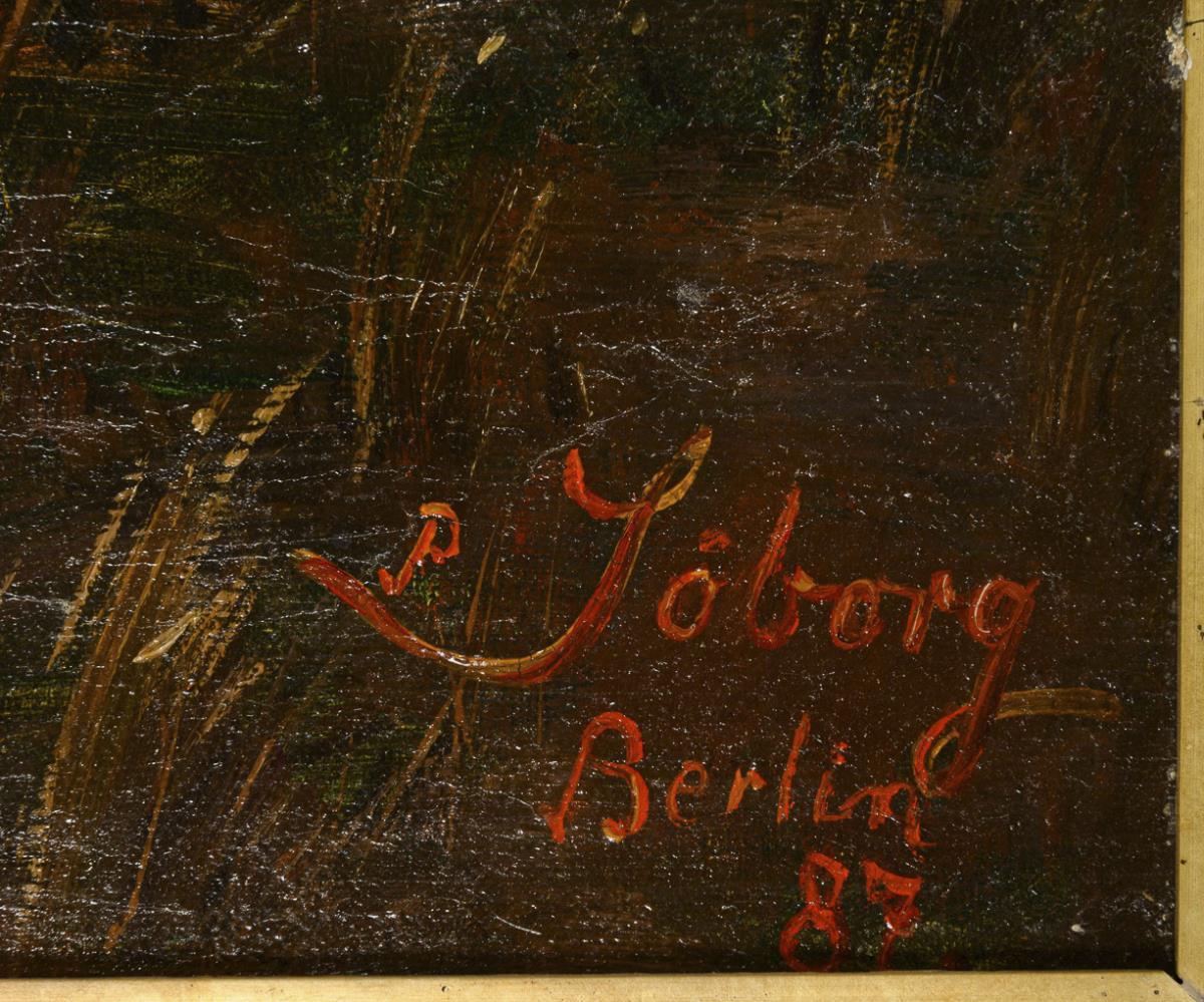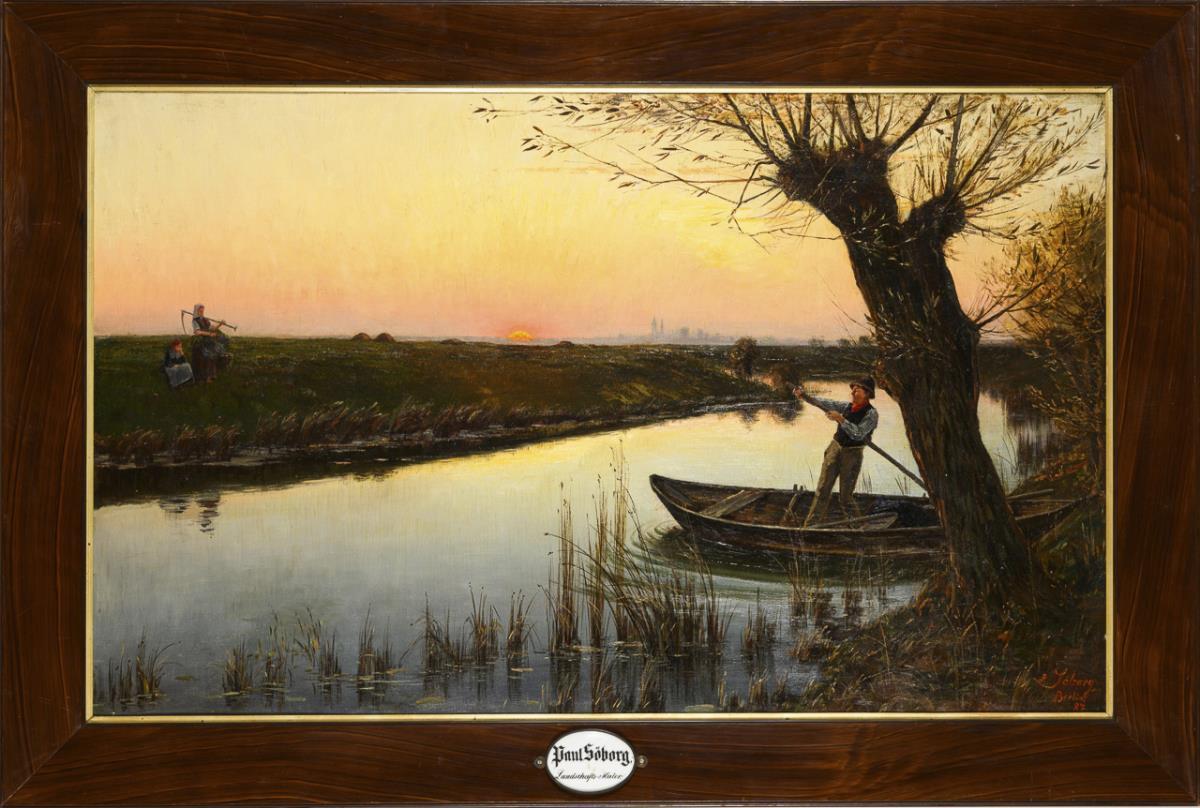 Junger Mann im Boot mit Blick zu Frau und Kind auf der Wiese bei Sonnenuntergang. Abgebildet im Katalog der 59. Ausstellung der Königl. Akademie der Künste im Landes-Ausstellungsgebäude zu Berlin, Berlin 1887, Nr. 835, S. 161; von Boetticher II,2, N° 7 bzw. 20. Zwei restaurierte Stellen mit Hinterklebungen.