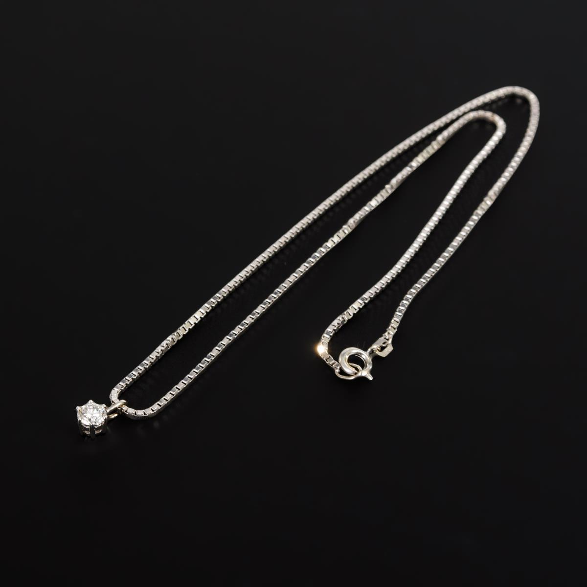 Weißgold 585 gestempelt. Brillant ca. 0,25 ct/schwach getöntes Weiß/PII. Kette L 40 cm. 6,2 g.