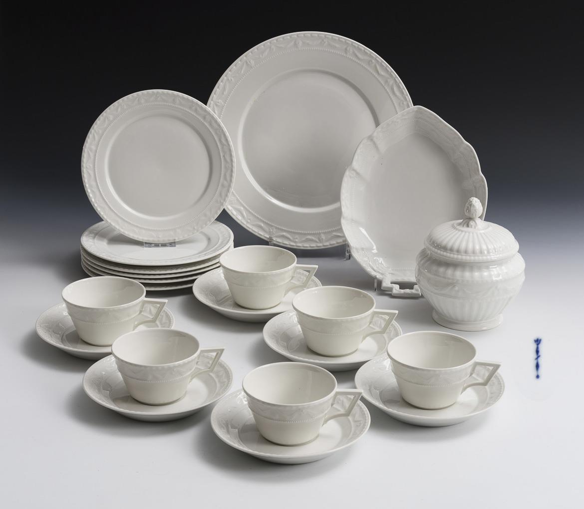6 Tassen, 6 Untertassen, 6 Frühstücksteller, Zuckerdose (H 15 cm), Blattschale (L 23,5 cm), Kredenzteller (Ø 29 cm).