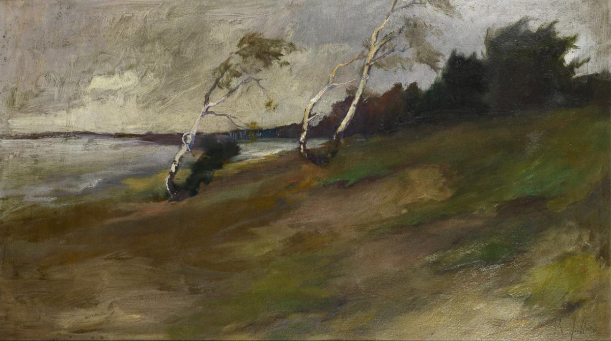 Ostseestrand mit vom Wind gebeugten Bäumen unter grauem Himmel. Minimale Altersspuren.