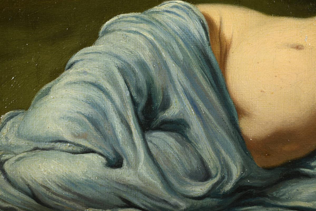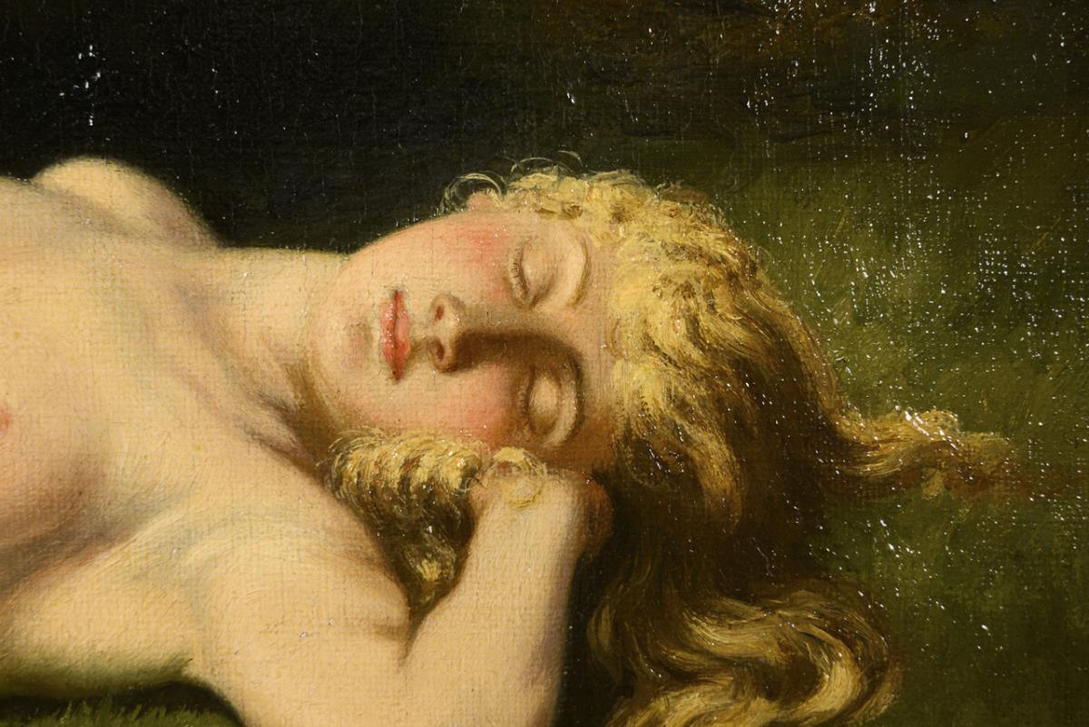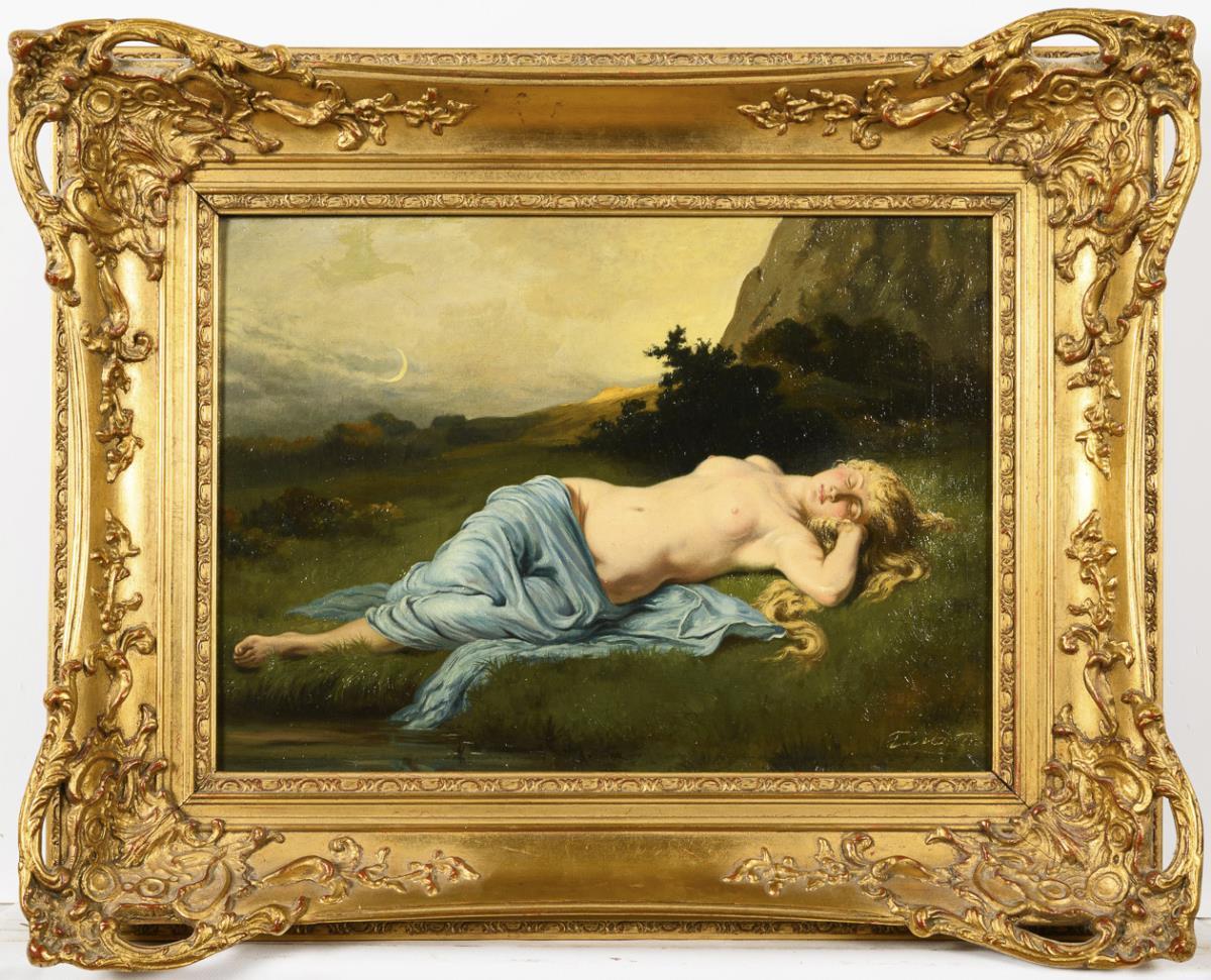 Im Gras am Ufer eines Gewässers schlafende, nackte Frau in blauem Tuch vor aufgehender Mondsichel. Im Himmel retuschiert.