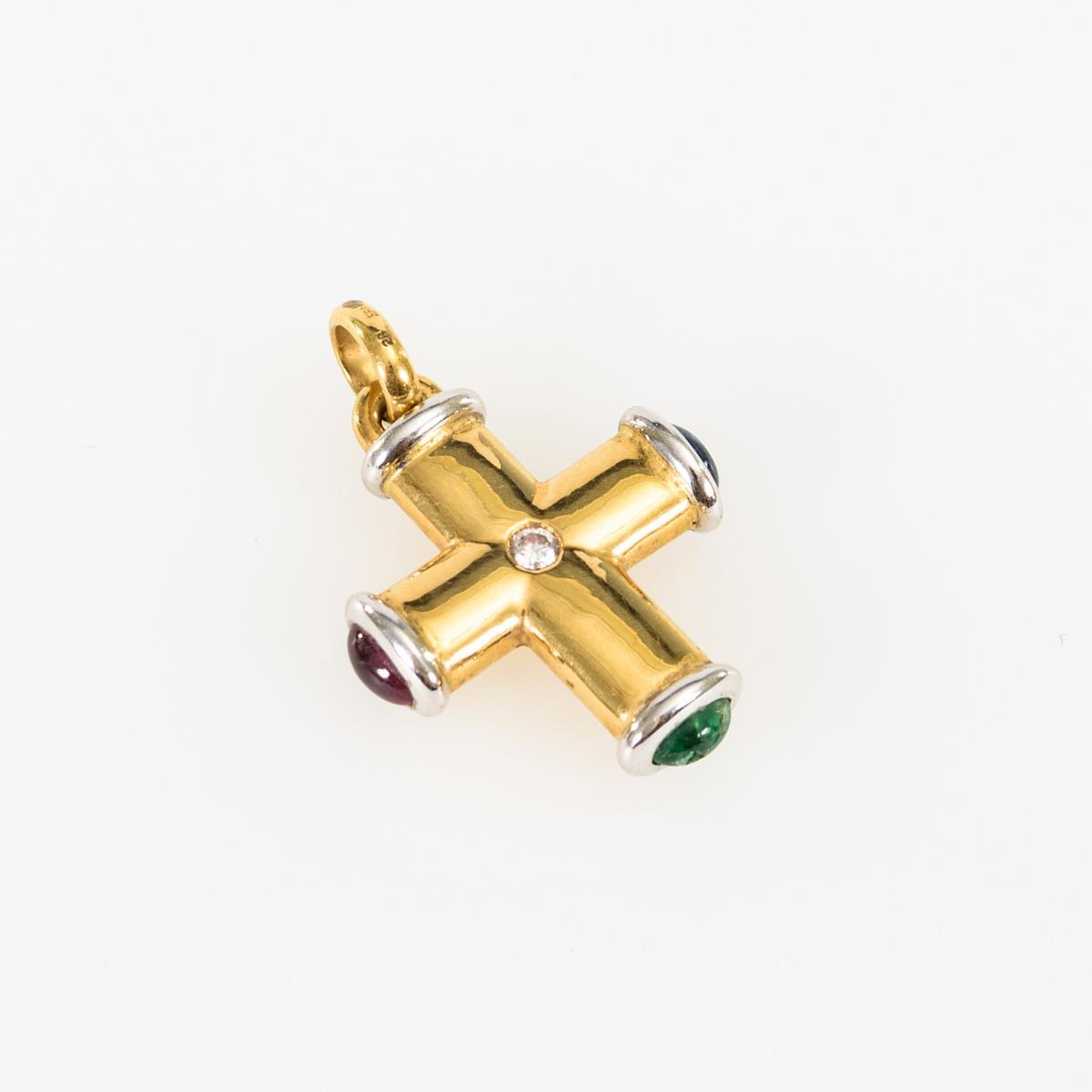 Massives Kreuz mit kleinem, eingelassenem Brillant, Saphir-, Smaragd-, und Rubincabochon.