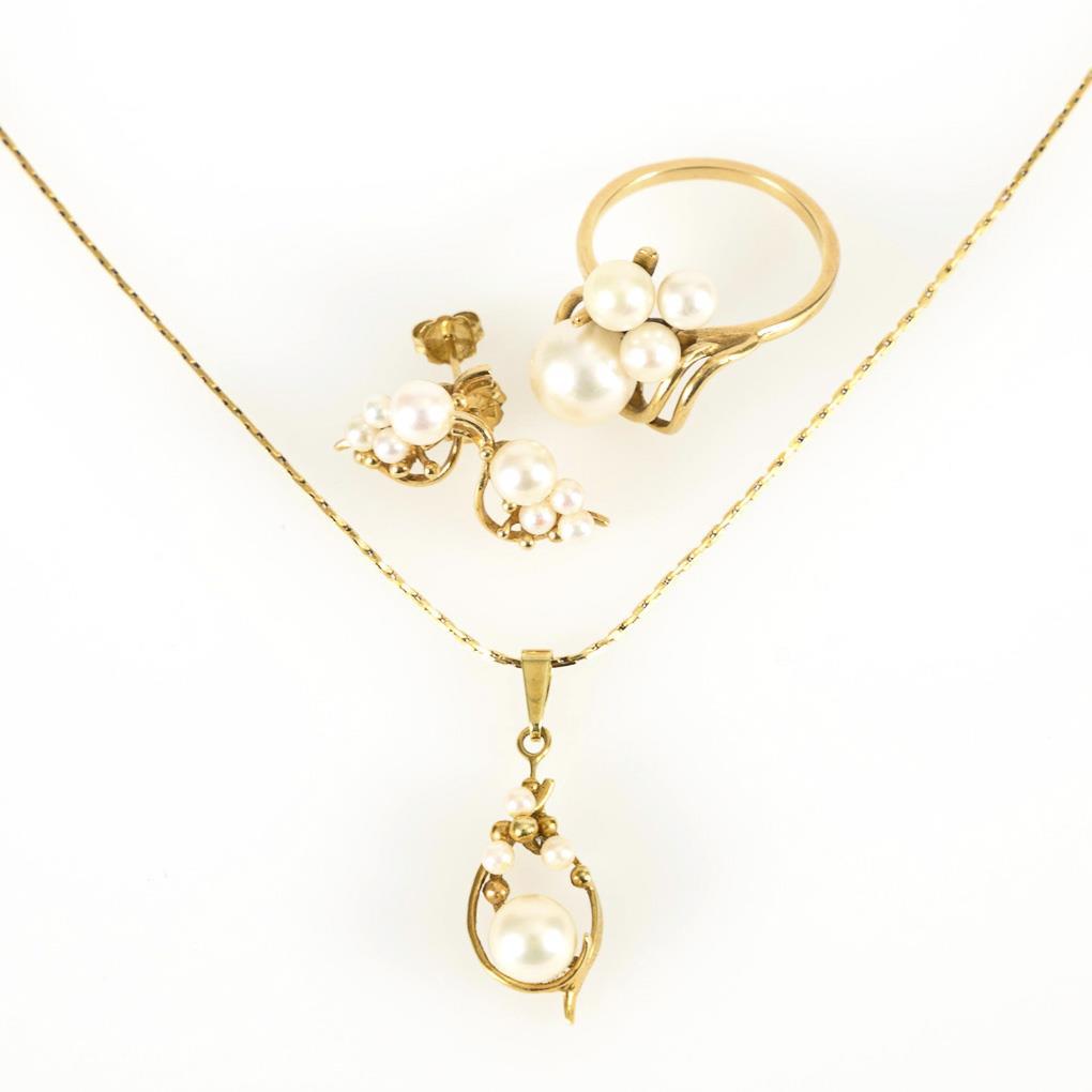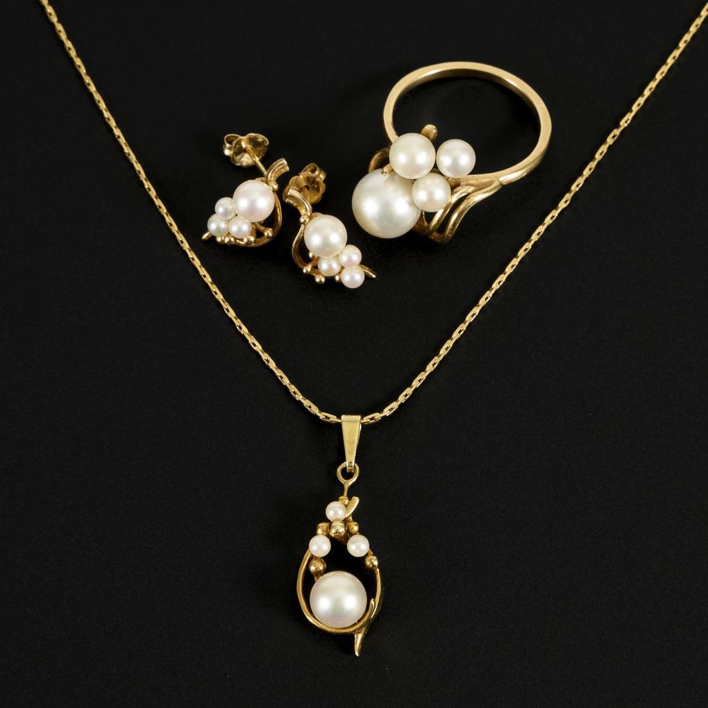Anhänger, Ring und Ohrsteckerpaar mit Zuchtperlen. Panzerkette mit Ringfederschließe, schmale Ringschiene, Steckmechanik.