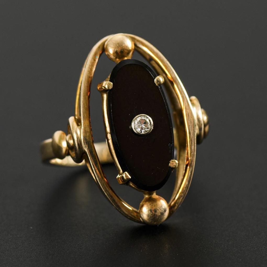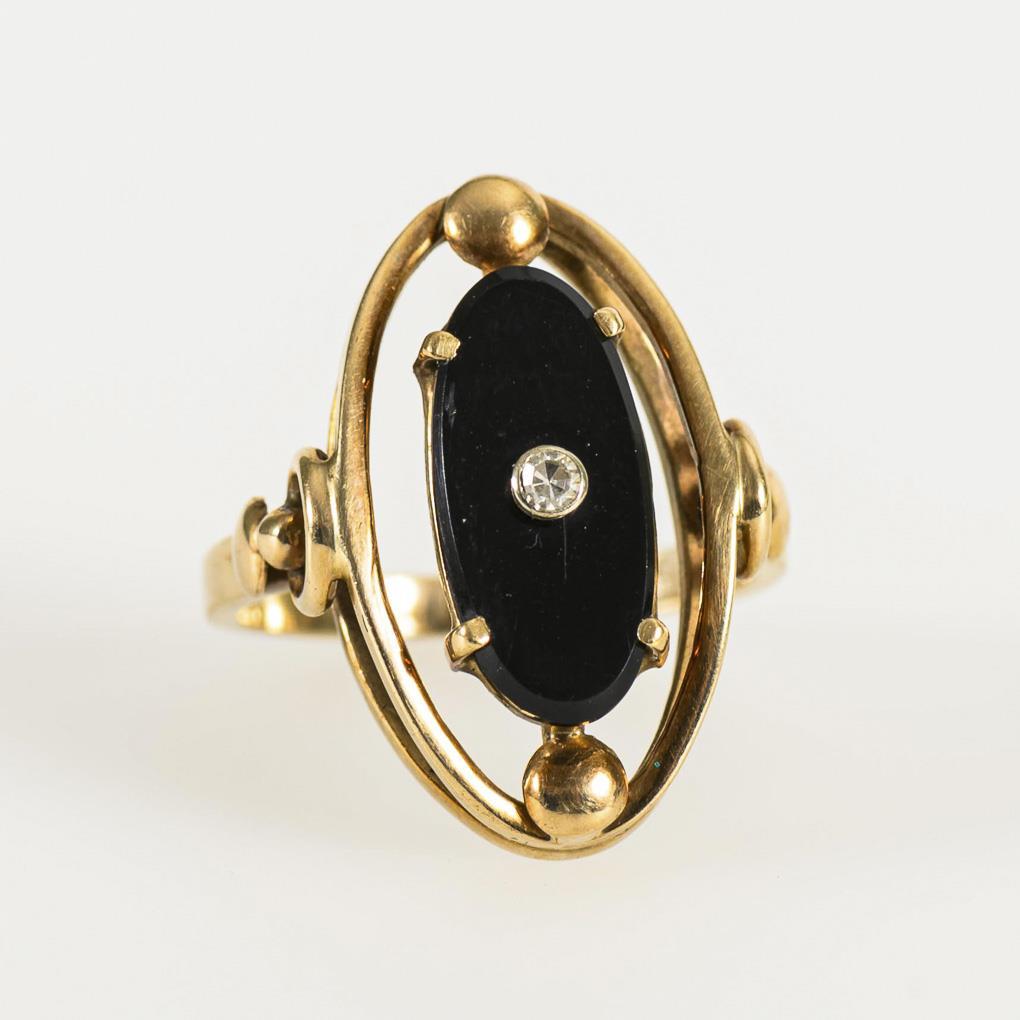 Krappengefasste Onyxtafel mit kleinem zargengefasstem Diamant, zwischen schmaler Schiene.
