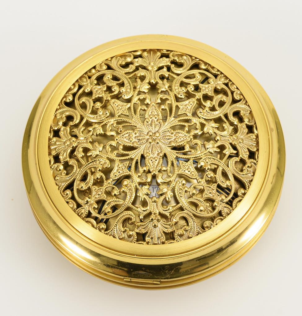 Floral durchbrochen gefertigtes Gehäuse mit ausklappbarem Werk. Leichte Altersspuren.