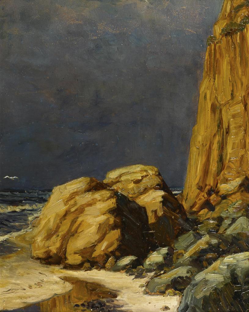 Heller Sonnenschein über den Felsen der Küste mit herannahender Möwe. Leichte Altersspuren.
