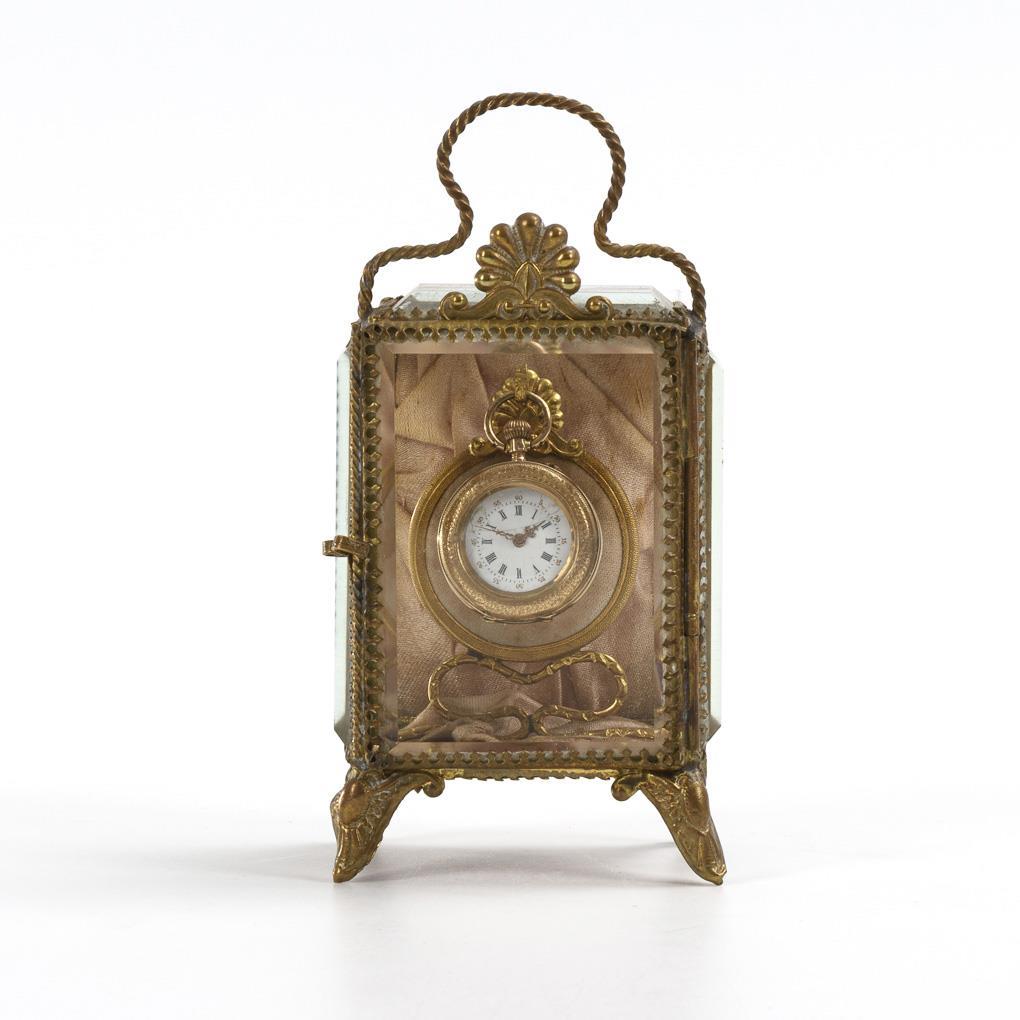 Ziseliertes und mit farbig rest-emaillierten Blütenzweigen und einem Vogel verziertes 585 Goldgehäuse, monogrammierte Wappenreserve, weißes Emailzifferblatt mit römischen und arabischen Zahlen, Louis Quinze-Zeigern, Werk mit Zylinderhemmung, läuft. 4-seitig facettiert verglaster Uhrenhalter in Schreinform mit Messing-Gerüst, Bügelhenkel und Muschelornament. Leichte Alters- und Gebrauchsspuren, teils mit Defekten, Zifferblatt defekt.