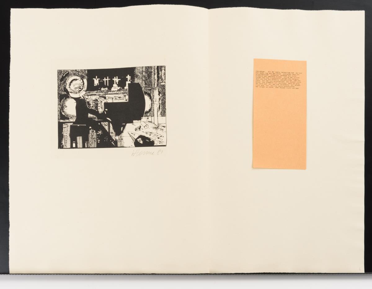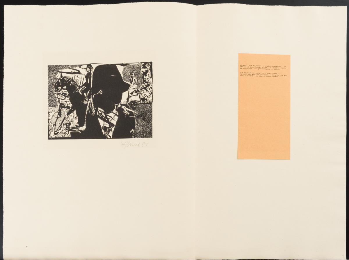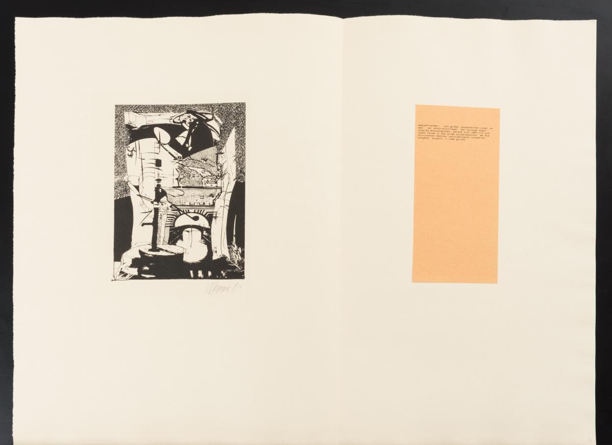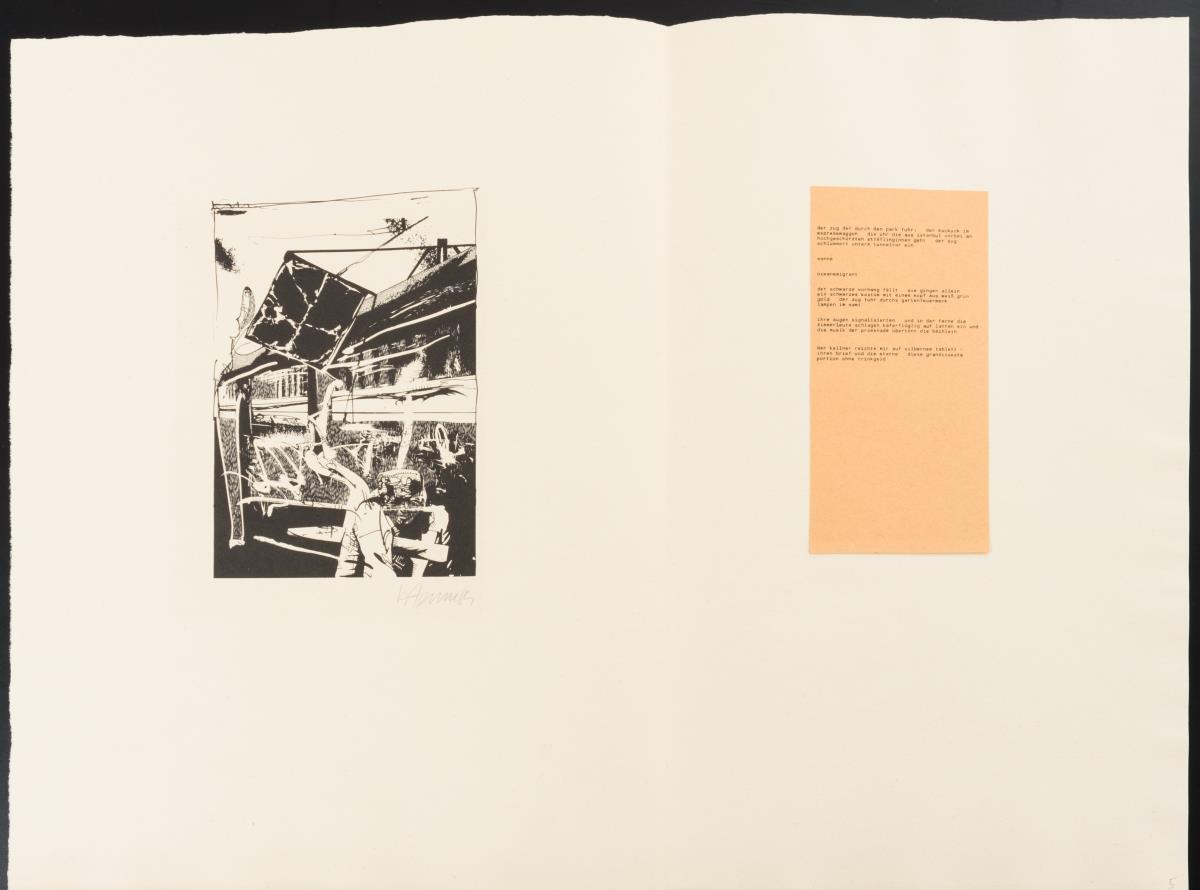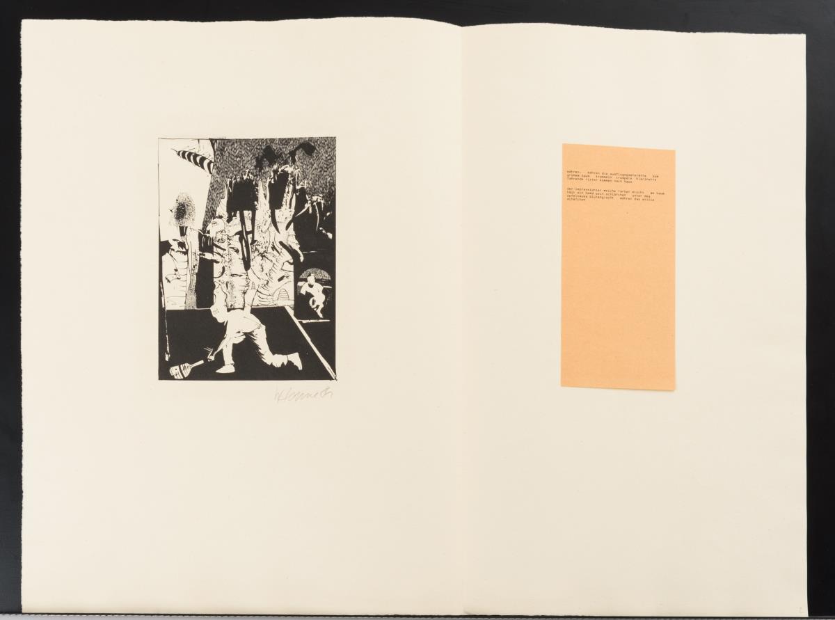 Vollständige Mappe mit 6 Faltblättern und Illustrationen von Wolfgang Henne zu Gedichten von Vitezslav Nezval; links Lithografie, rechts aufgeklebtes Gedicht, 1 Einlegeblatt mit aufgeklebter Titellithografie; gedruckt in den Werkstätten der Hochschule für Graphik und Buchkunst.