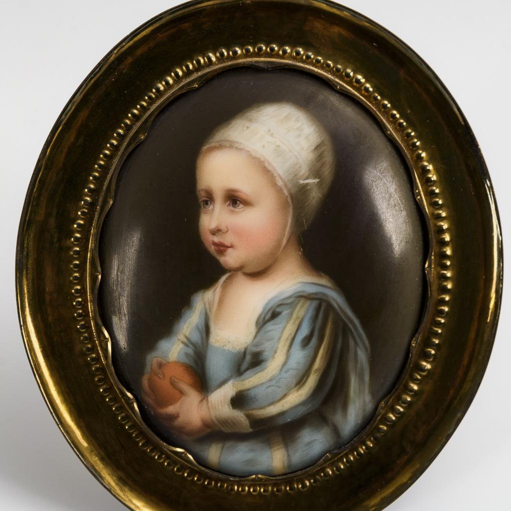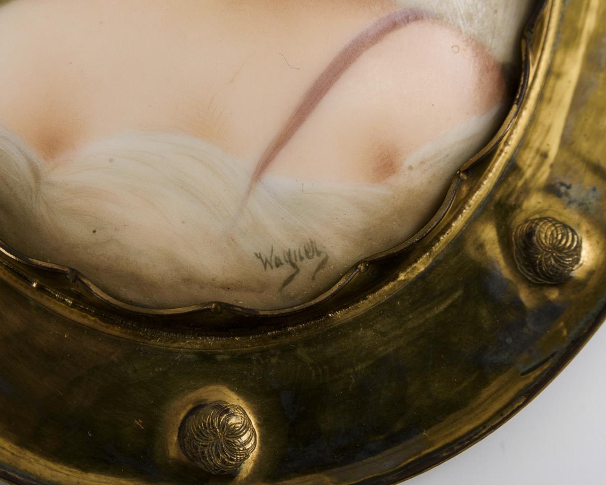 Kleine, ovale Bildplatten im Messingrahmen. 1x signiert "Wagner" mit Damenporträt, 1x mit der Darstellung des Kindes "Baby Stuart" nach Anthony van Dyck, 1x mit der Darstellung der büßenden Magdalena.