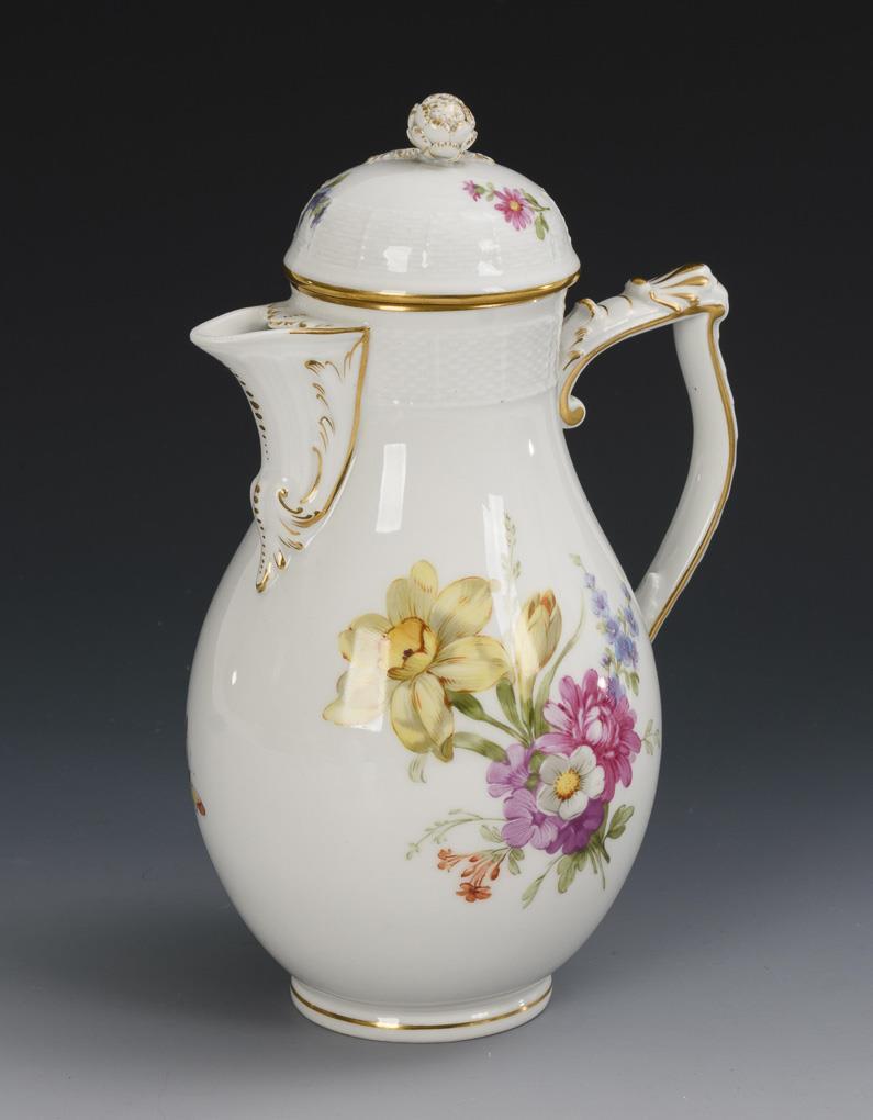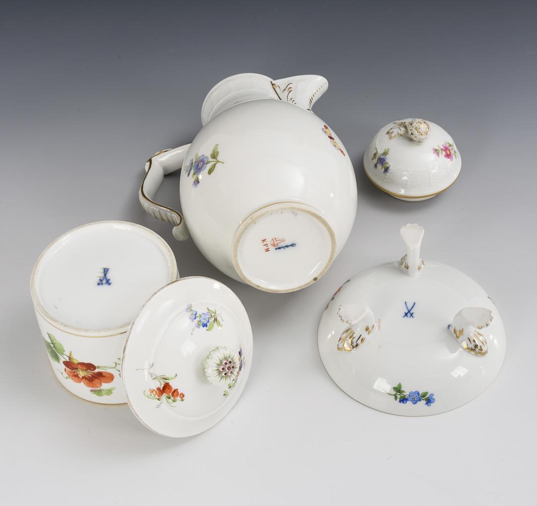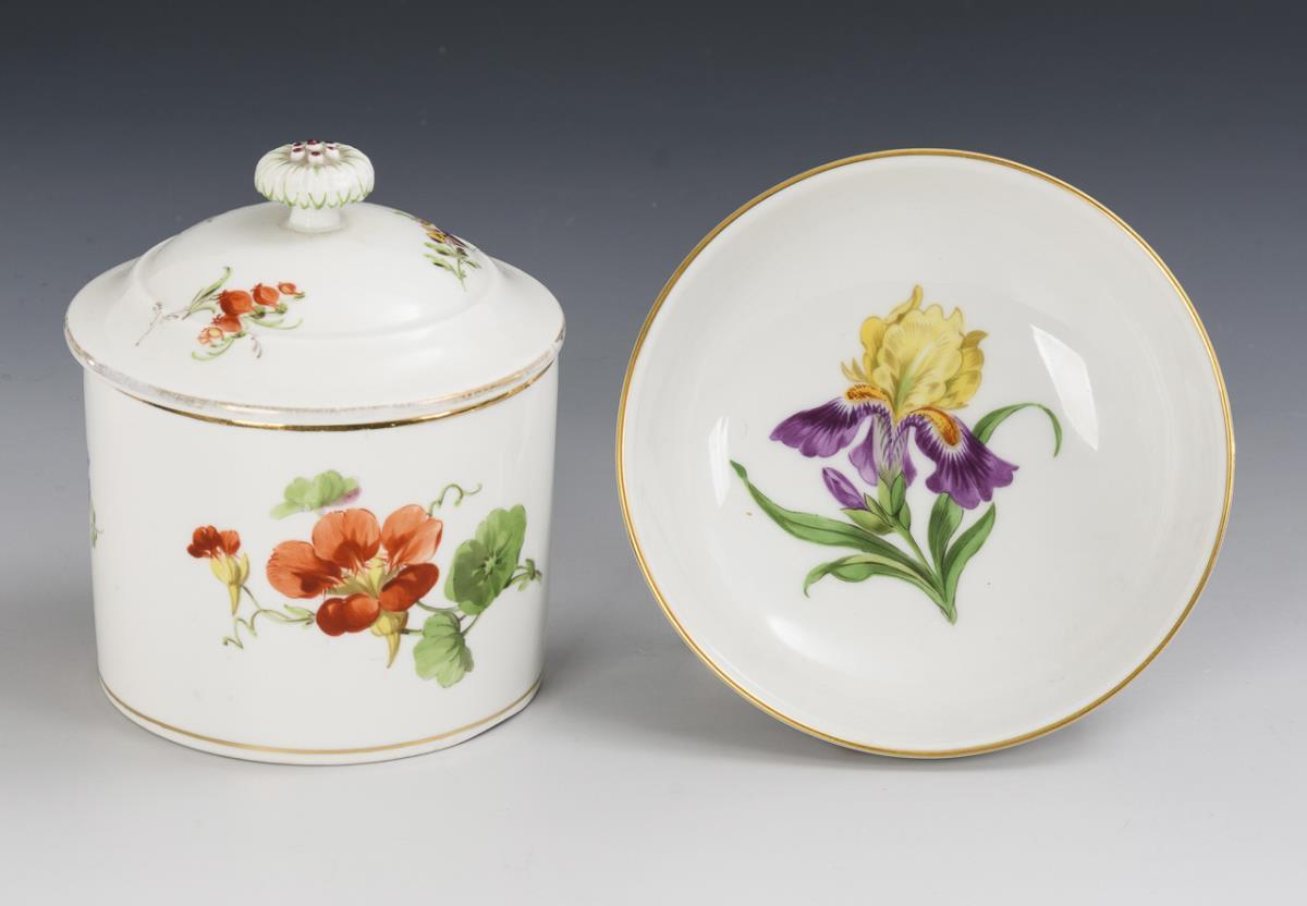 1x KPM Berlin, 1. H. 20. Jh., Modell "Altozier": Kaffeekanne mit einem schauseitigen Blumenbukett mit Narzissen (H 21 cm). /2x Meissen, ab 1850-2. H. 20. Jh., 2 und 4 Schleifstriche: Zylinderdose (H 10,5 cm) und Schälchen mit drei Tatzenfüßen (H 5 cm). 1 Tatzenfuß minimal bestoßen.