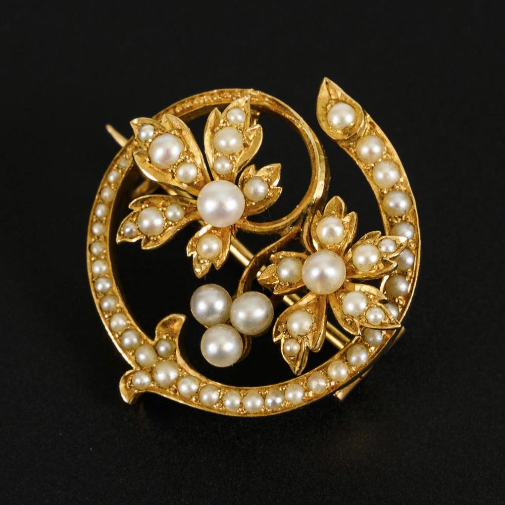 Florale Rahmenbrosche mit Perlchenbesatz. Hakenverschluss.
