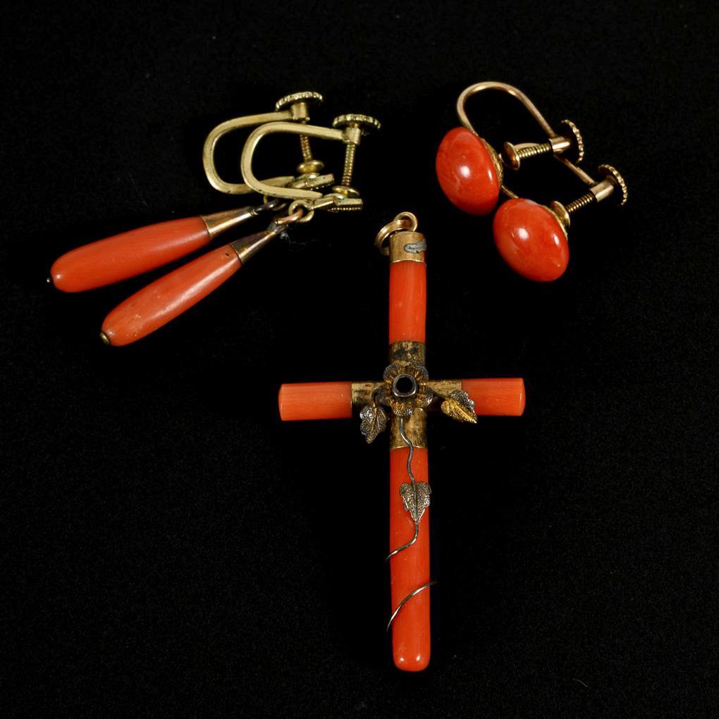 Kreuzanhänger mit integrierter Stanhope-Linse (Bild undeutlich). 2 Ohrringgpaare mit Korallentropfen und Korallenlinsen. Schraubmechanik. 1 Schraubmechanik ergänzt.