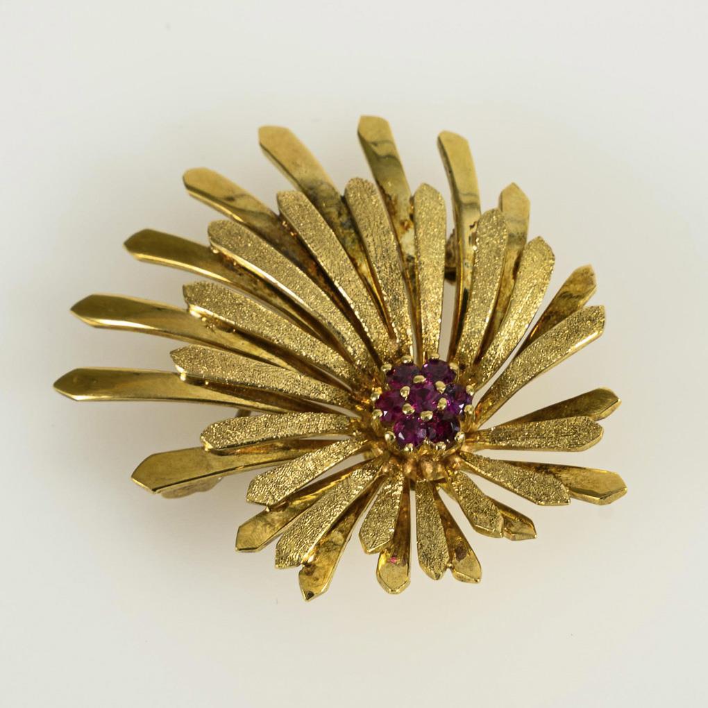 Handgearbeitete Brosche mit 7 chatongefassten Rubinen. Kugelhaken.