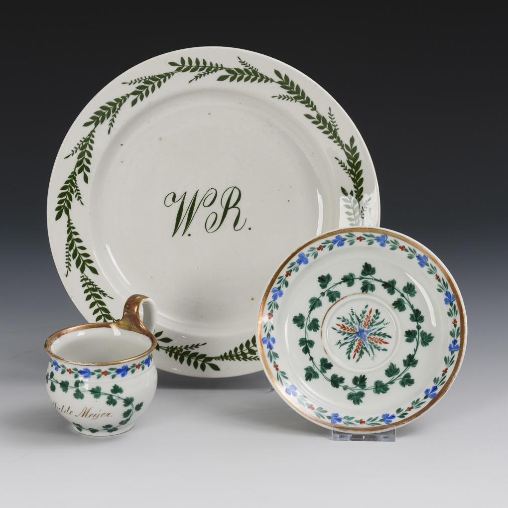 1x Speiseteller mit unterglasurgrüner Blattbordüre und dem Monogramm "W.R." im Spiegel (Ø 23 cm). / 1x Tönnchentasse (H 8 cm) mit Floralmalerei, dem schauseitigen Namen "Mathilde Meyer" und originaler Untertasse (Ø 14 cm). Minimaler Goldabrieb.