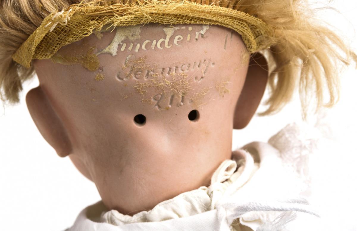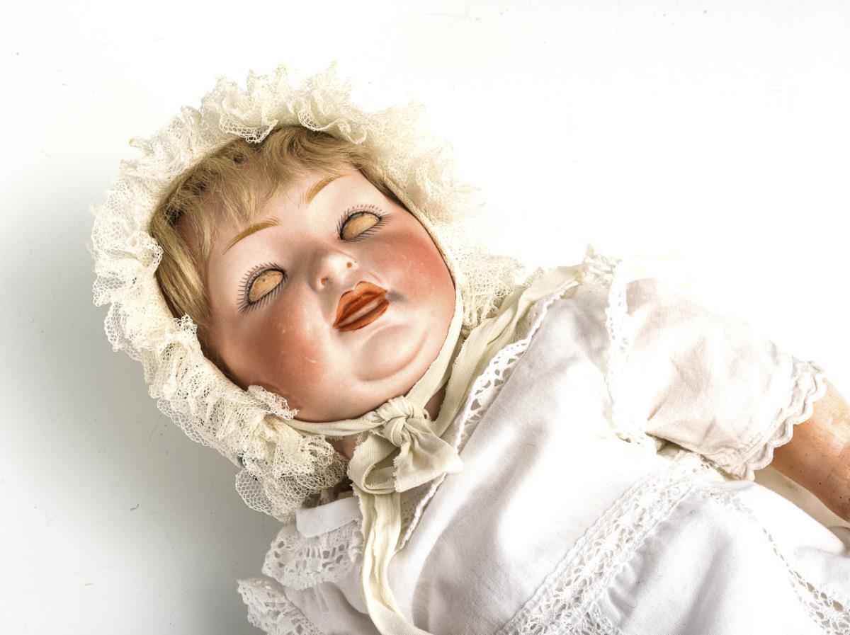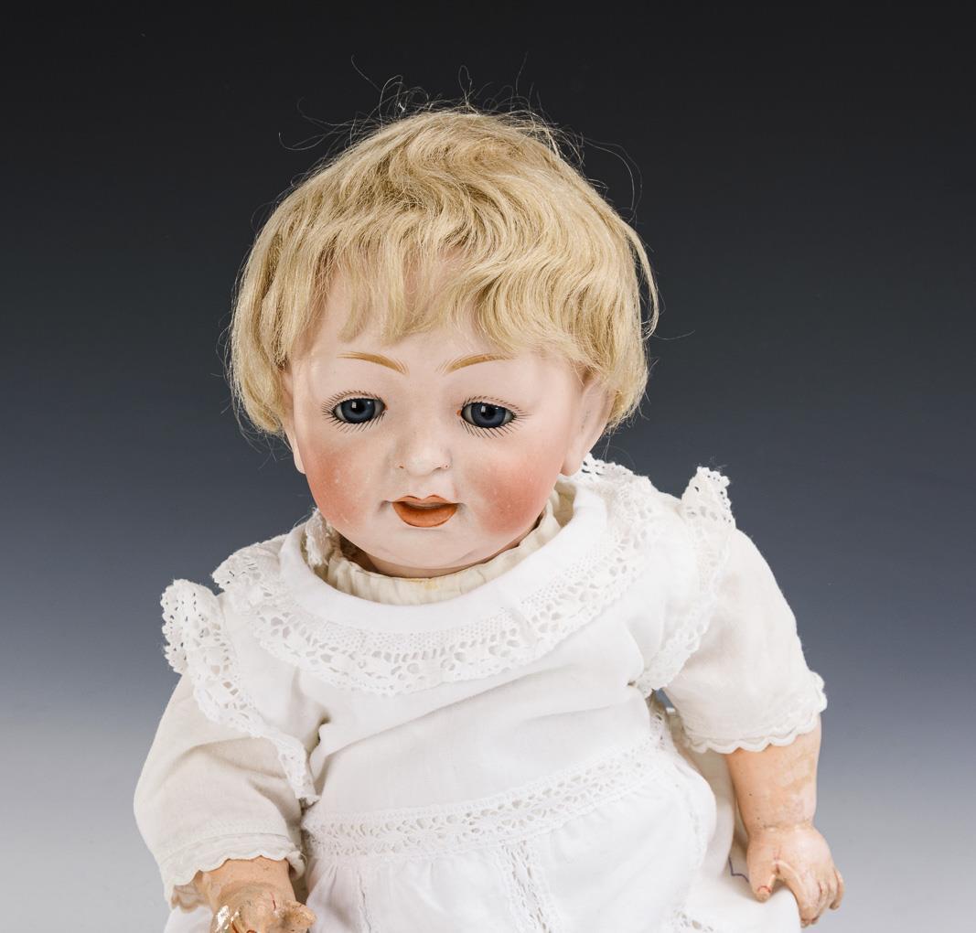 Kurbelkopf, blaue Schlafaugen, blonde Mohairperücke. 5-teiliger Sitzbabykörper. Weißes Kleidchen, schönes altes Häubchen mit Perlstickerei. Kopfdeckel fest vergipst; nicht durchleuchtet: keine Defekte sichtbar. Körper partiell übermalt.