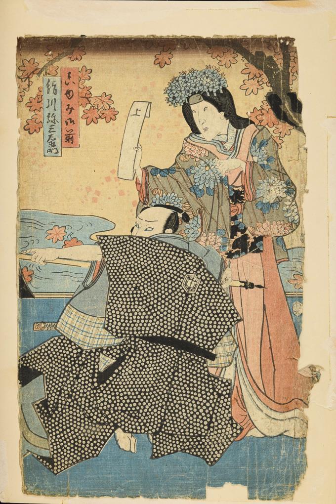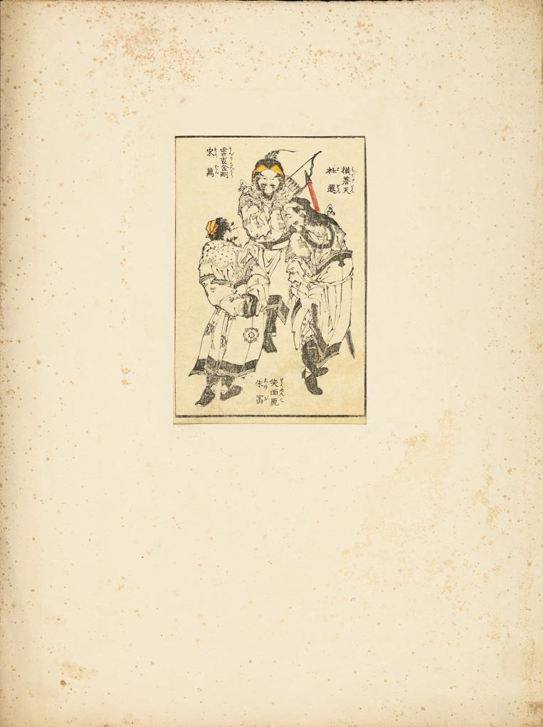 Triptychon: Männer und eine Frau mit Schwertern, wohl Kunisada. Zusammen 36 x 74 cm. / Blatt eines Samurais, wohl Toyokuni, 36 x 25 cm. / Druck auf dünnem Papier, Bild eines Schreibers vor der Silhouette eines Torii. Wohl von Kunichika, 35 x 23,5 cm, mit kleinen Löchern. / Zwei zusammengehörige Teile. Jeweils Samurai mit Dame. Wohl von Toyokuni. Mit stärkeren Randschäden, auf Trägerpapier, ca. je 37 x 25 cm. / Kleiner Holzschnitt mit drei Figuren und Schriftzeichen. 18 x 12,5 cm, im Passepartout. / Zusammengefügter zweiteiliger Holzschnitt mit drei Personen. Rückseite mit Text. Wohl von Kunisada. Zusammen 34 x 47 cm, im Passepartout.
