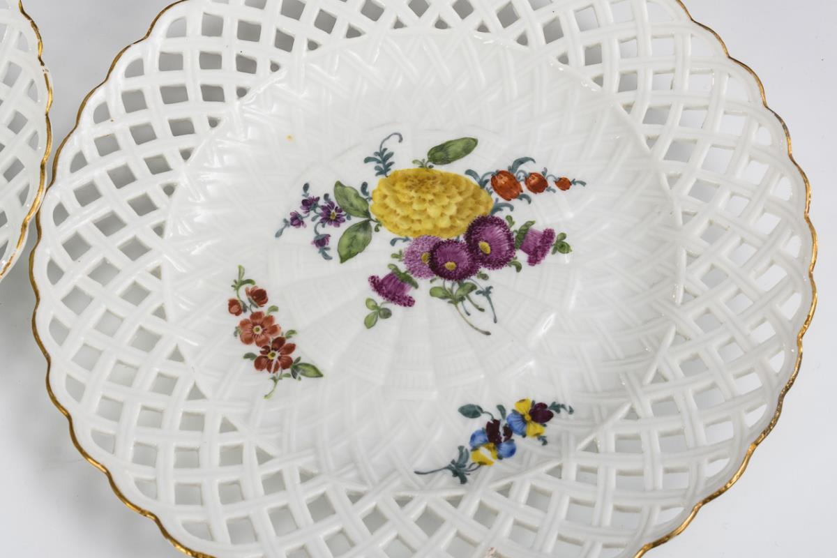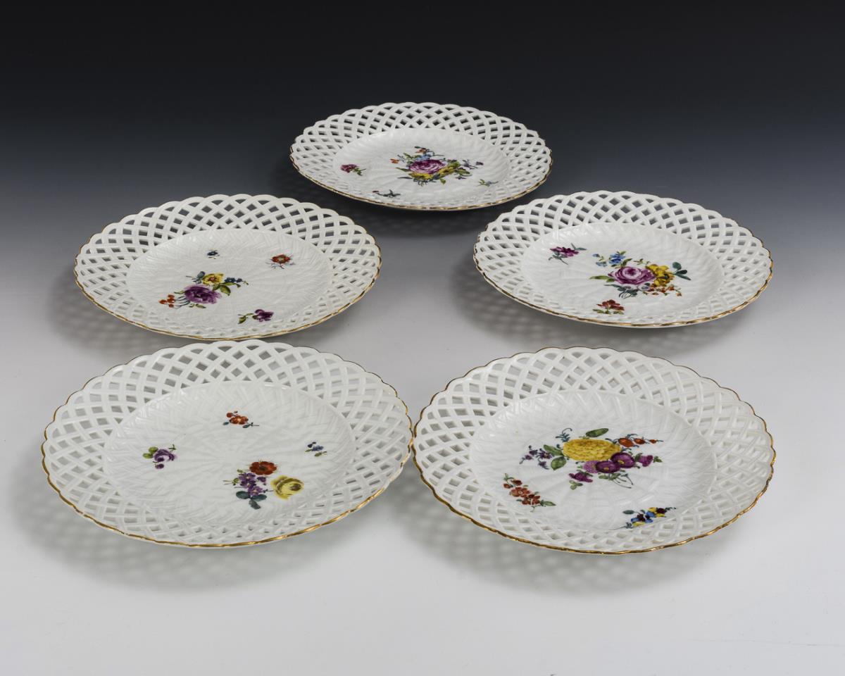 5 barocke Durchbruchteller mit Blumenmalerei. Meissen.