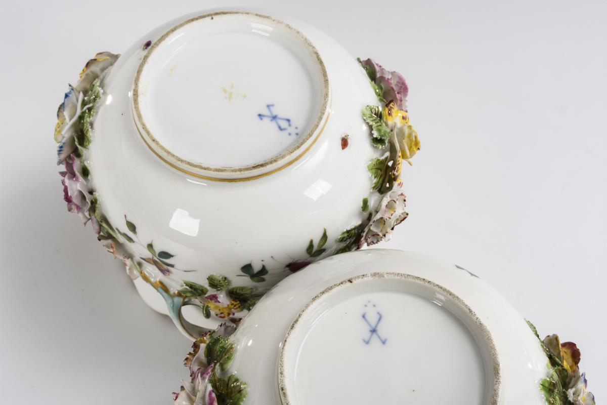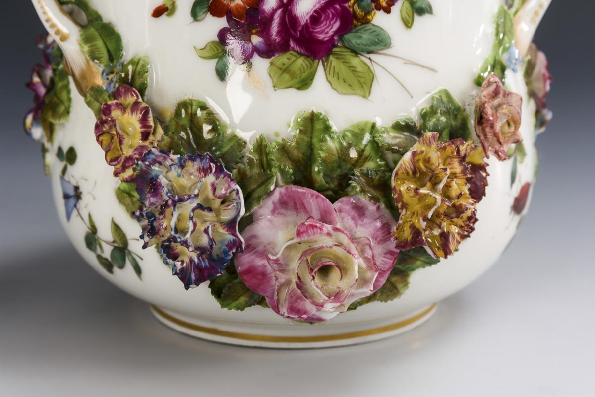 Leicht gebauchte Form mit zwei Henkeln und einer üppigen, aufgelegten Blütengirlande. 1 Henkel geklebt, Bestoßungen am Belag, Gold berieben.