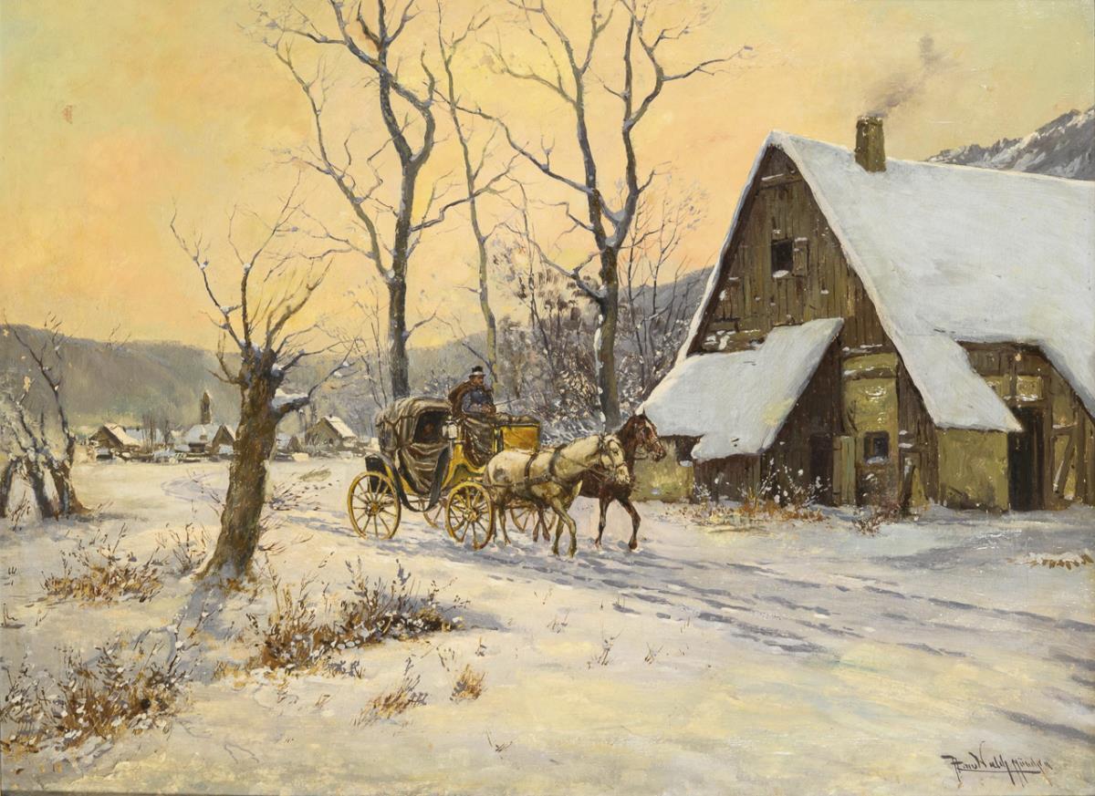 Münchener Maler: Kutsche im Winter nahe Ortschaft