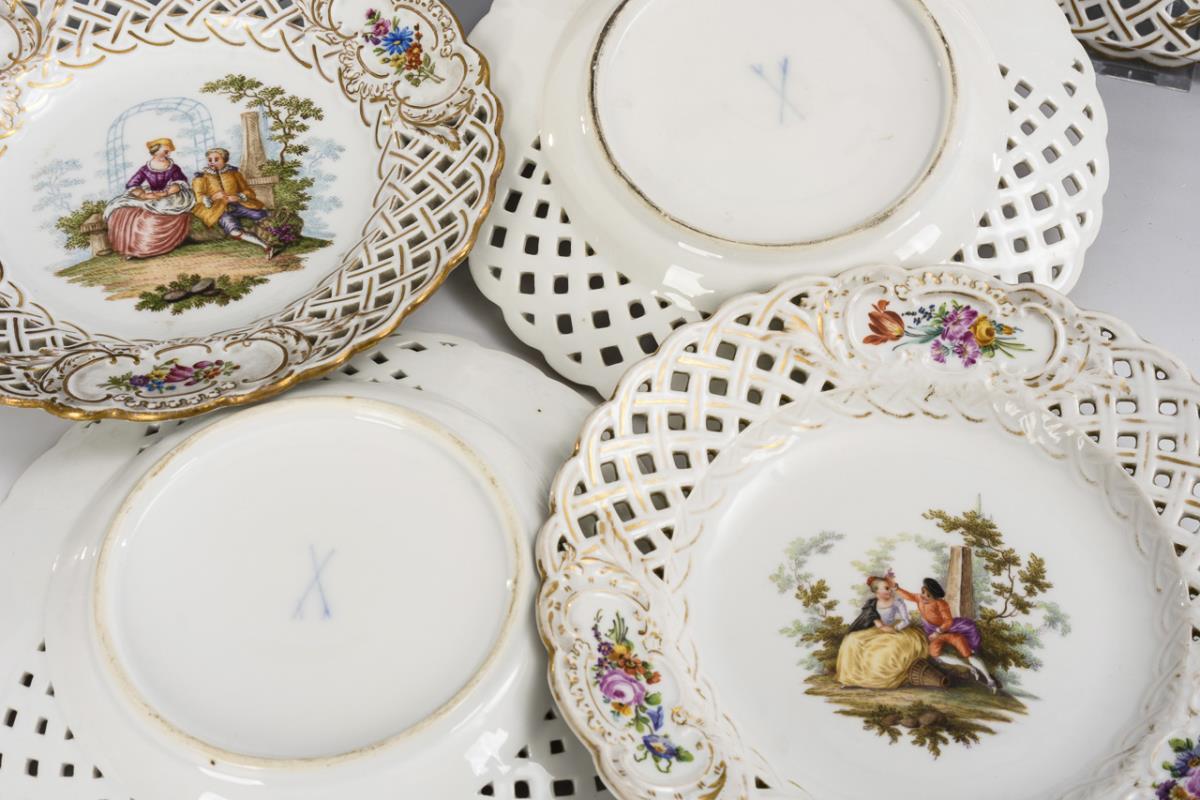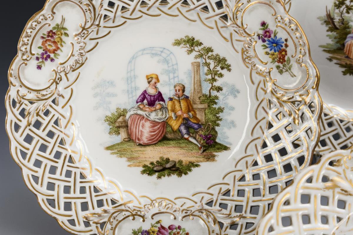 6 Durchbruchteller mit Watteau-Malerei. Aelteste Volkstedter.