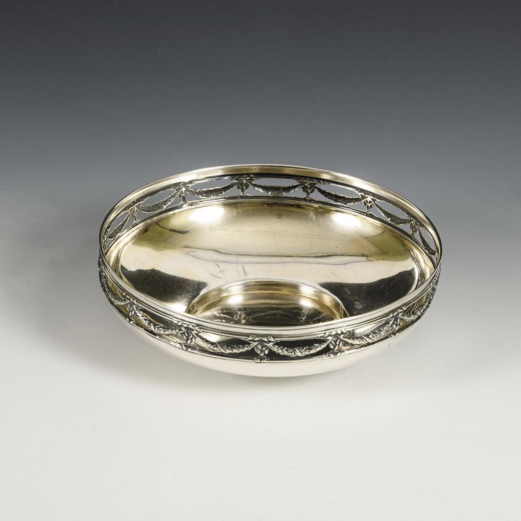 Runde Schale mit durchbrochenem Girlandenrand. Gebrauchsspuren, minimal gedellt.