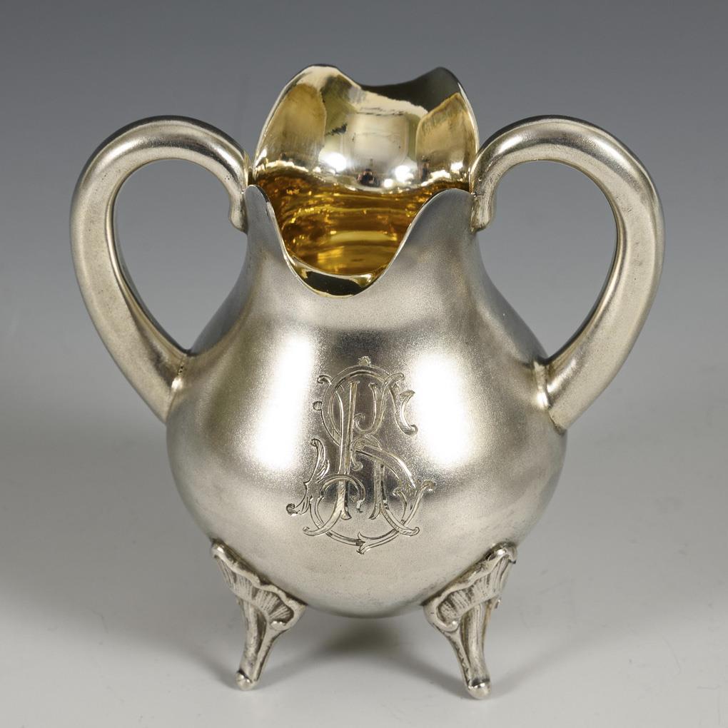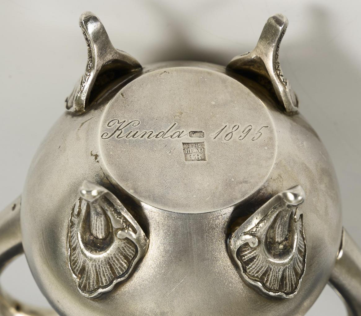 Ungewöhnliche Form mit doppeltem Ausguss und 2 Henkeln, schauseitige Monogrammgravur "KS", unterseitig bezeichnet "Kunda 1895". Minimal gedellt.