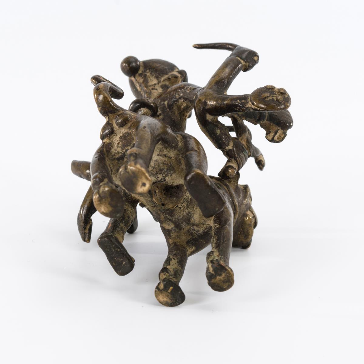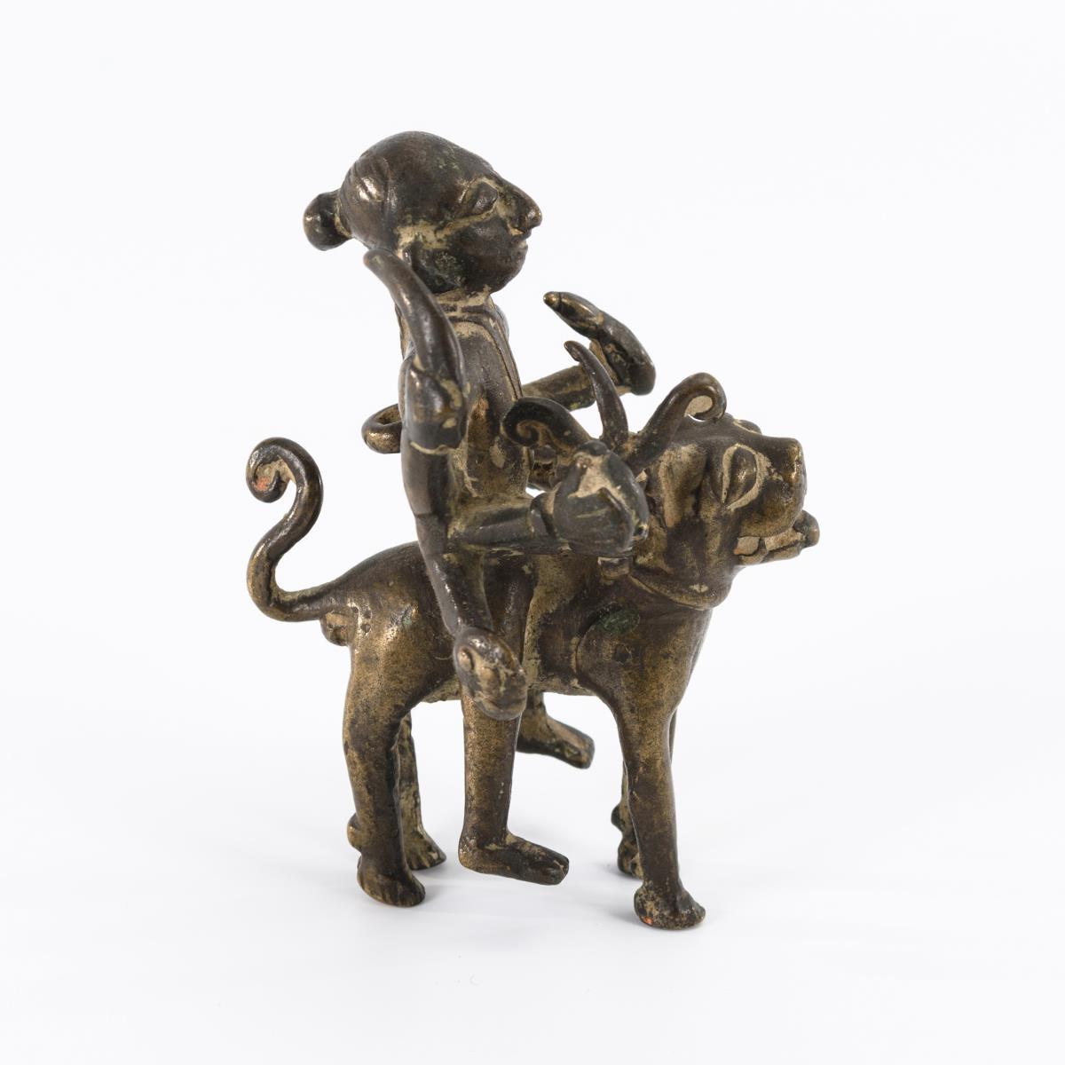 Auf einem Fabeltier (Hund?) reitende, sechsarmige Figur mit verschiedenen