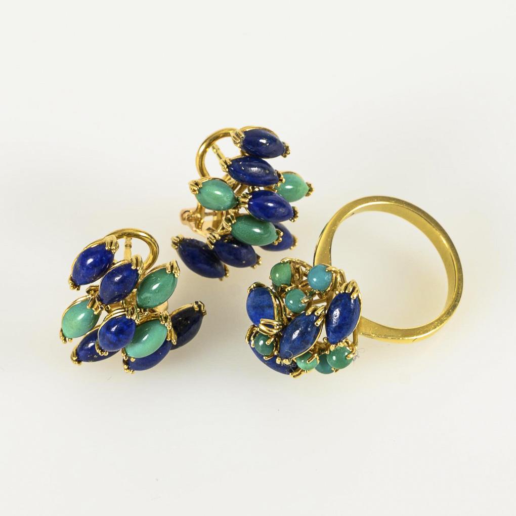 Cocktailring und Ohrsteckerpaar mit Lapislazulis und Türkisen.
