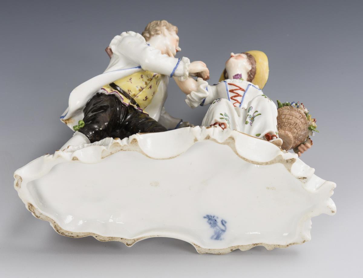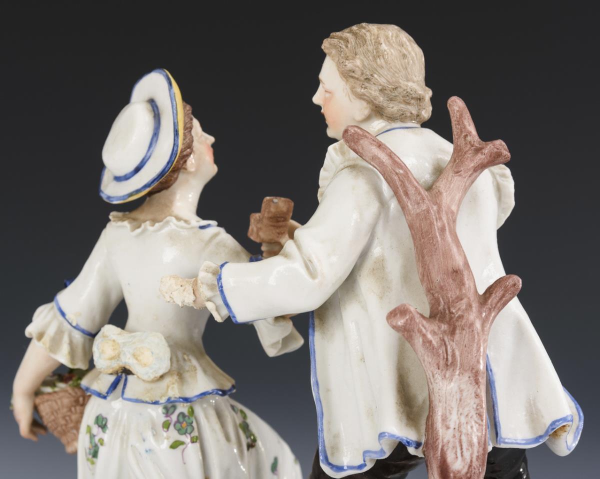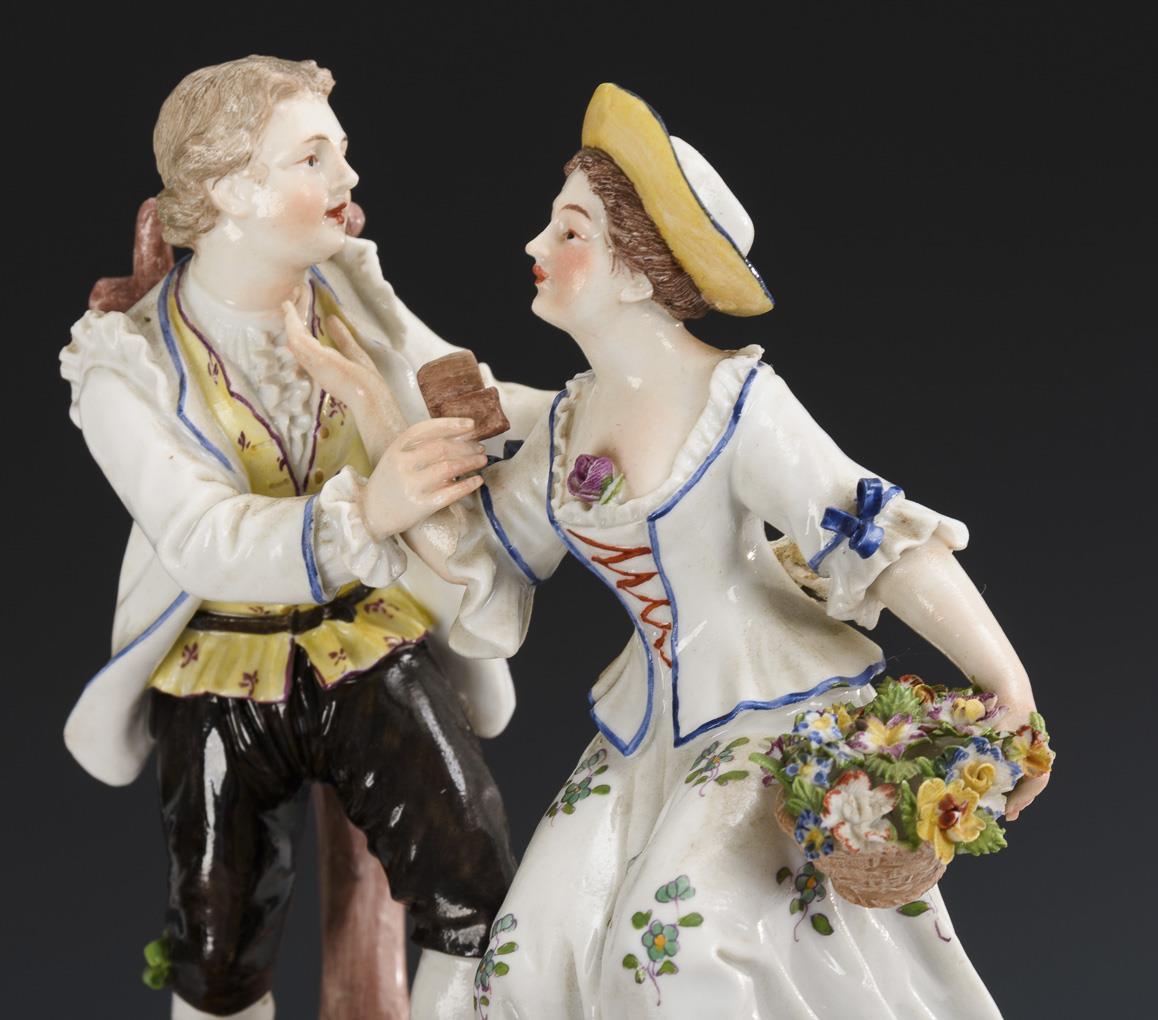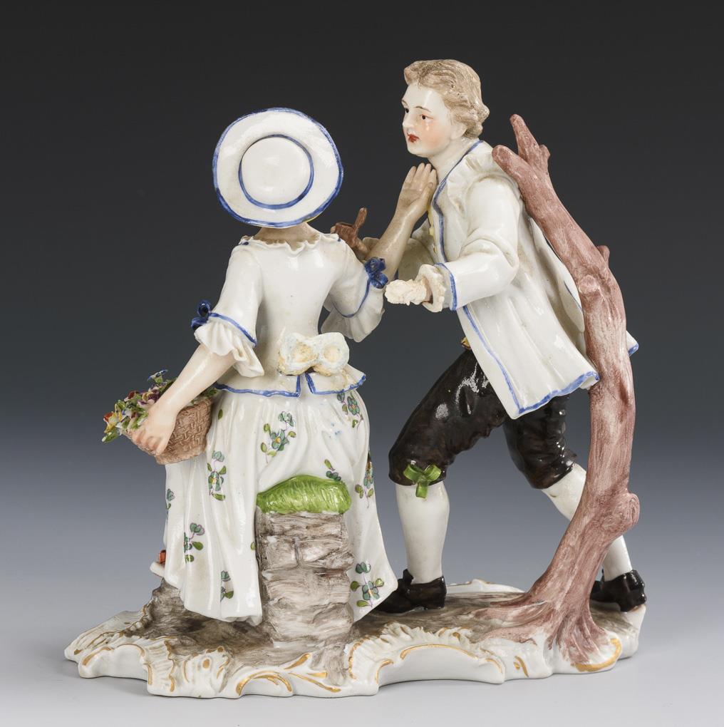 Auf einem Steinsockel sitzende Dame mit Blumenkorb sowie ein junger, der Dame eine Tabatiere reichender Herr. Linke Hand des Herren defekt, 2 Schleifenbänder bestoßen, Schleife verso an der Dame ergänzt.