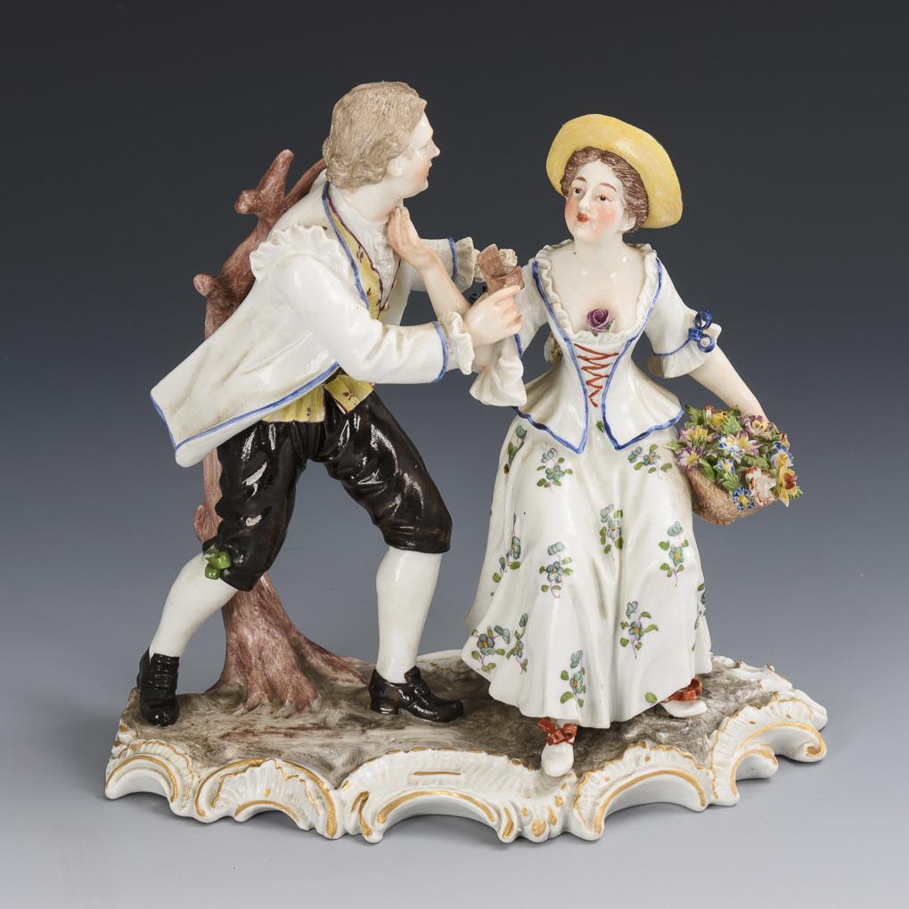 Auf einem Steinsockel sitzende Dame mit Blumenkorb sowie ein junger, der Dame eine Tabatiere reichender Herr. Linke Hand des Herren defekt, 2 Schleifenbänder bestoßen, Schleife verso an der Dame ergänzt.