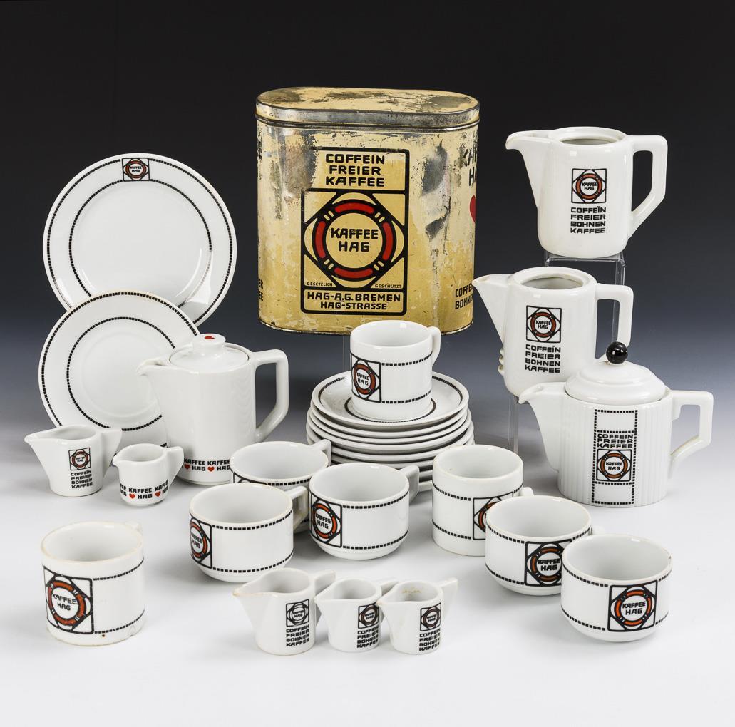 Hotelporzellan. Schauseitig jeweils das Logo der Kaffeemarke "Kaffee Hag". 4 verschiedene Kännchen (davon 2 ohne Deckel; H 10-13 cm), 5 Milchkännchen (H 4-5 cm), 5 + 3 Tassen (H 4,5 und 6,5 cm), 6 + 3 Untertassen (Ø 14 und 13,5 cm) und 1 Teller (Ø 17 cm). Dazu eine Kaffeedose "Kaffee Hag" (H 21,5 cm). Blechdose berieben, Bestoßung am Innenrand eines Kannendeckels, Stand von 1 Tasse defekt.