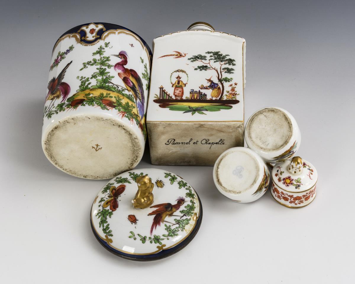 1x Ankermarke: Zylinderdose mit Vogelmalerei und metallmontiertem Deckelrand (Metallmontierung des Dosenrandes fehlt; H 16 cm). / 1x bezeichnet "Pannel et Chapelle": rechteckige Dose mit Knaufdeckel und Chinoiseriemalerei (H 17,5 cm). / 1x Helena Wolfsohn: Gewürzschälchen mt Vogelmalerei (L 9 cm). Partieller Goldabrieb.