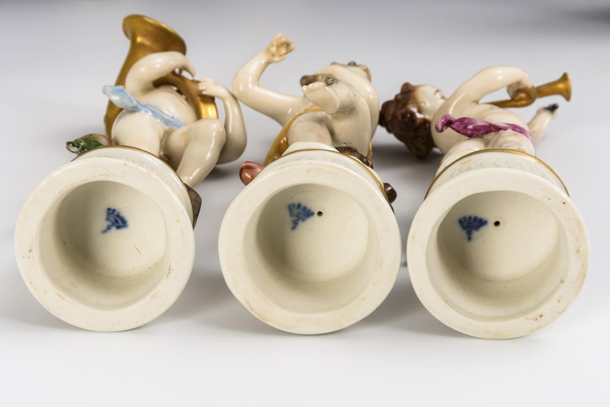 Je auf einem Rundsockel an einem Baumstamm stehender oder sitzender Putto mit Trommel, Dudelsack, Fagott, Horn, Schalmei bzw. Querflöte. Querflöte fehlt.