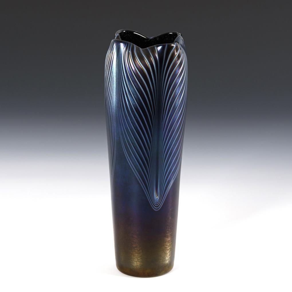 Rubinrotes Glas mit aufgeschmolzenen, zu einem dreiteiligen Federmuster ausgezogenen farblosen und silbergelb überlagerten Fäden, irisiert. H 25 cm.
