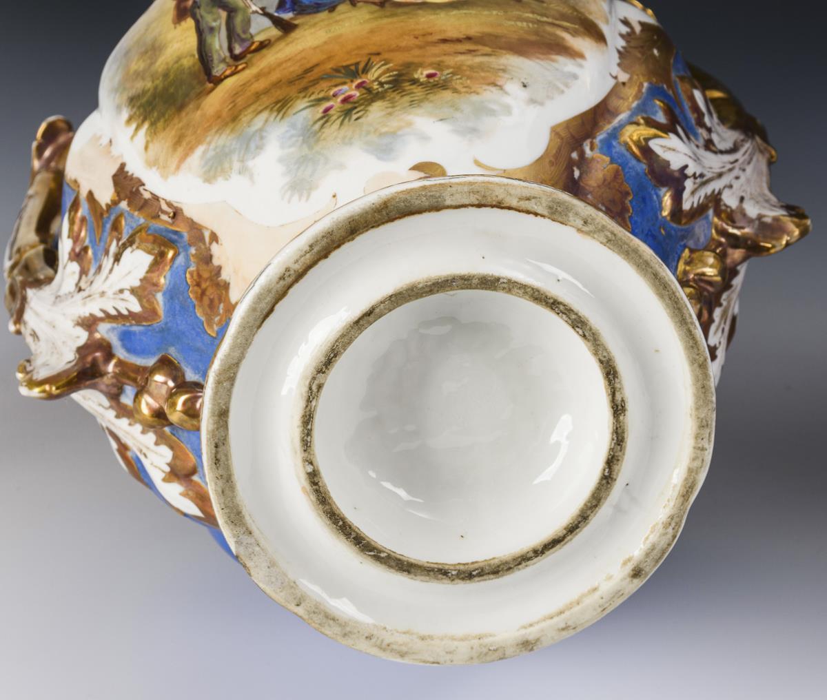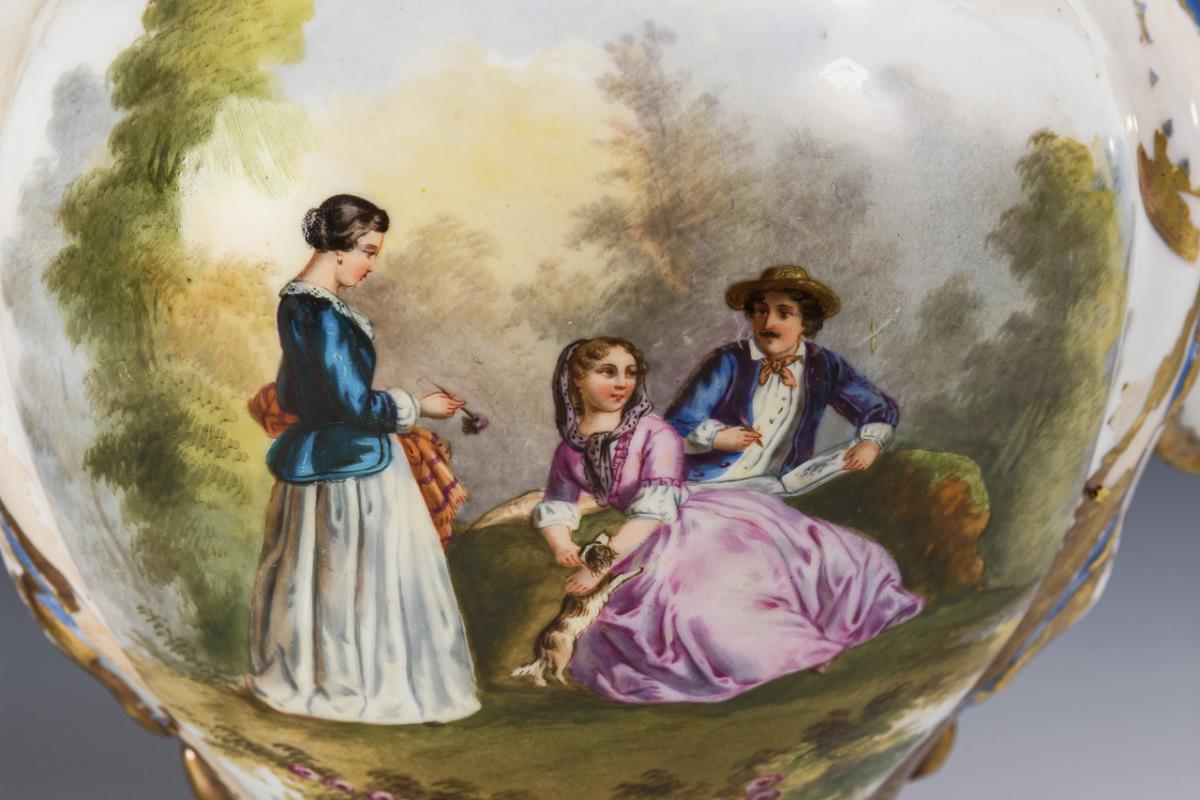 Balustervasen mit zwei floralen Henkeln. Blauer Fond, schauseitig je eine große Kartusche mit der Darstellung einer kleinen Gesellschaft in einer Parklandschaft bzw. eines Jägers mit zwei Damen. Gold berieben, 2 Henkel minimal bestoßen.