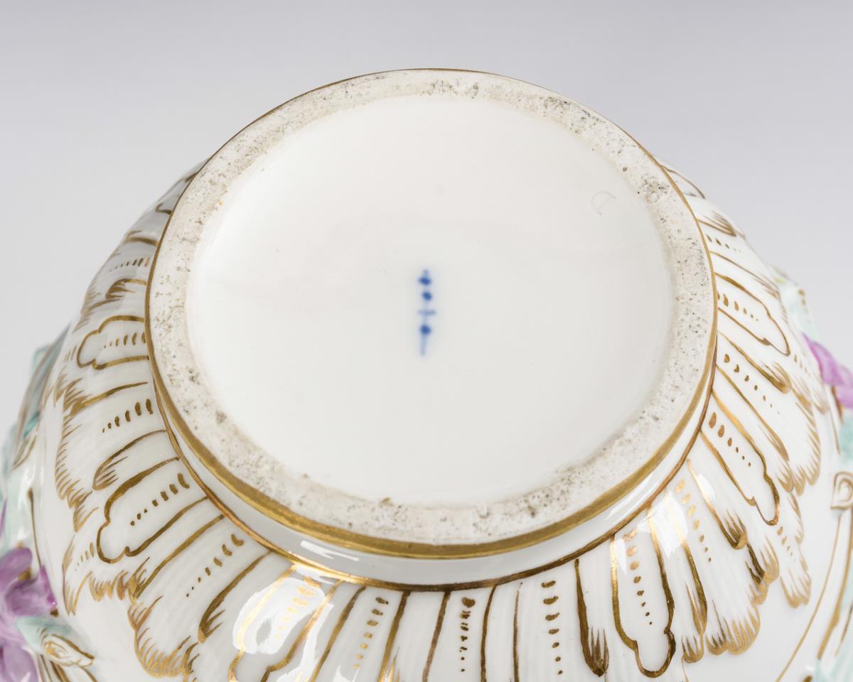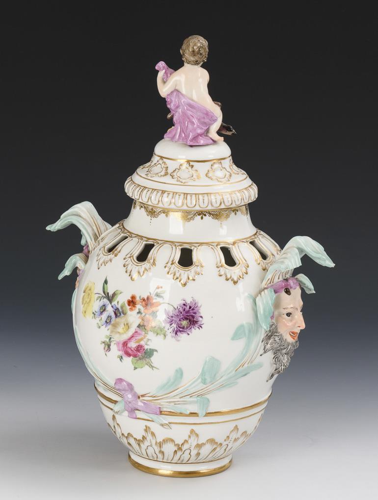 Balustervase mit zwei Faunskopfhandhaben, durchbrochener Schulter und Deckel mit einem Putto mit Adler. Beidseitig die Darstellung eines Blumenbuketts. Partieller Goldabrieb, 4 Handhabenblätter bestoßen.