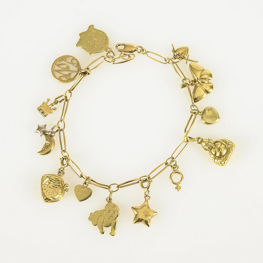Ankerkettenarmband mit 14 Abhängungen (u.a. Krone, Mond, Börse, Stern, Baby, Buddha, Schmetterling, Herz) an Karabinerschließe. Herz, Börse leicht gedellt.