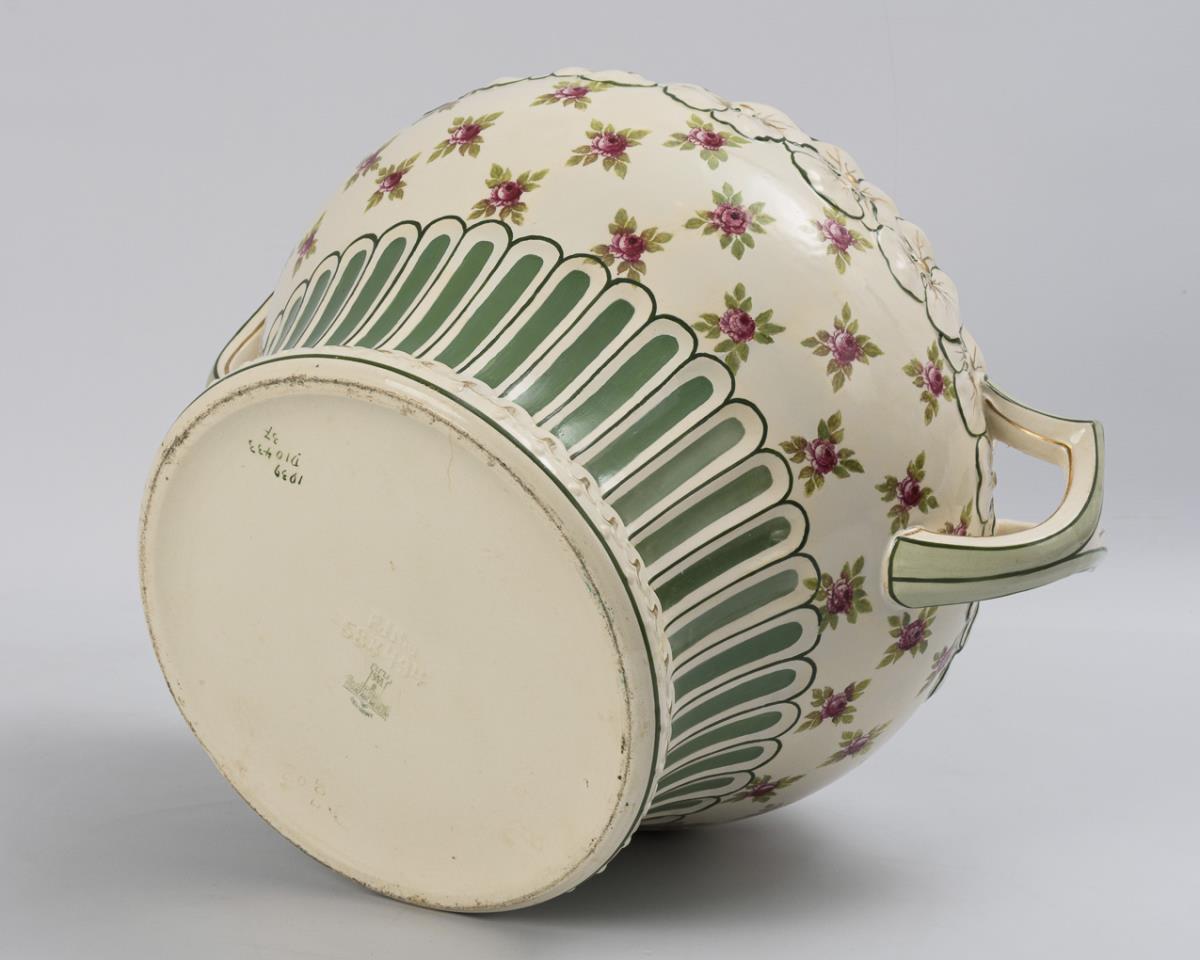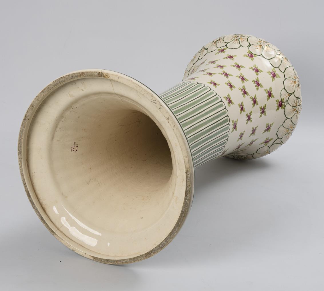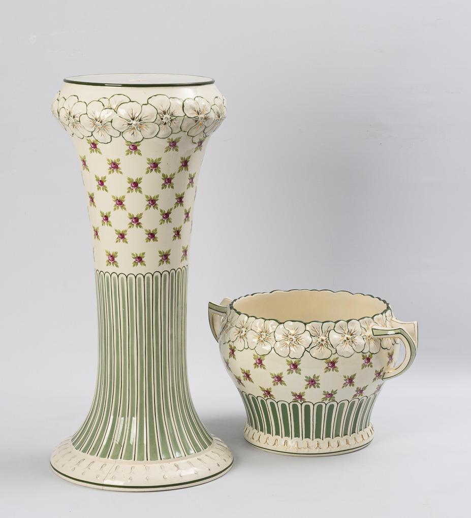 Steingut, farb- und goldstaffiert, farbiger Druckdekor. Cachepot H 30 cm, Ø Innenrand 32,5 cm, Säule H 79 cm, Gesamt H 109 cm. 20,1 kg.