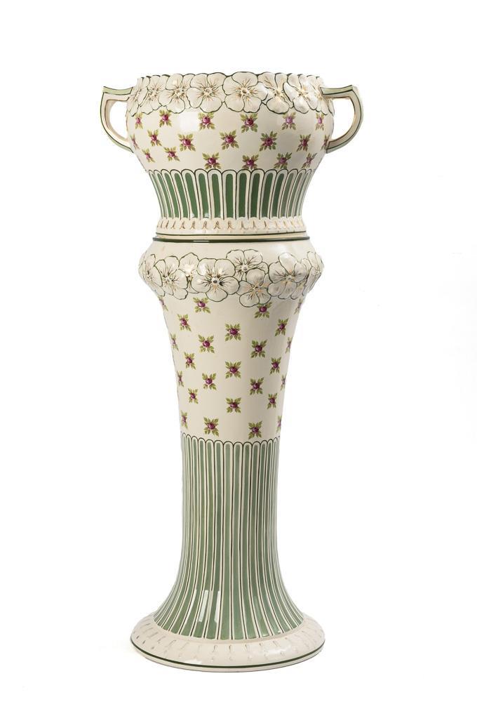 Großer Zweihenkeltopf mit Blütenreliefs, auf Rundsäule. Streifen-, Blüten- und Röschendekor. Cachepot restauriert, goldberieben, Säulenstand rissig, partiell haarrissig.